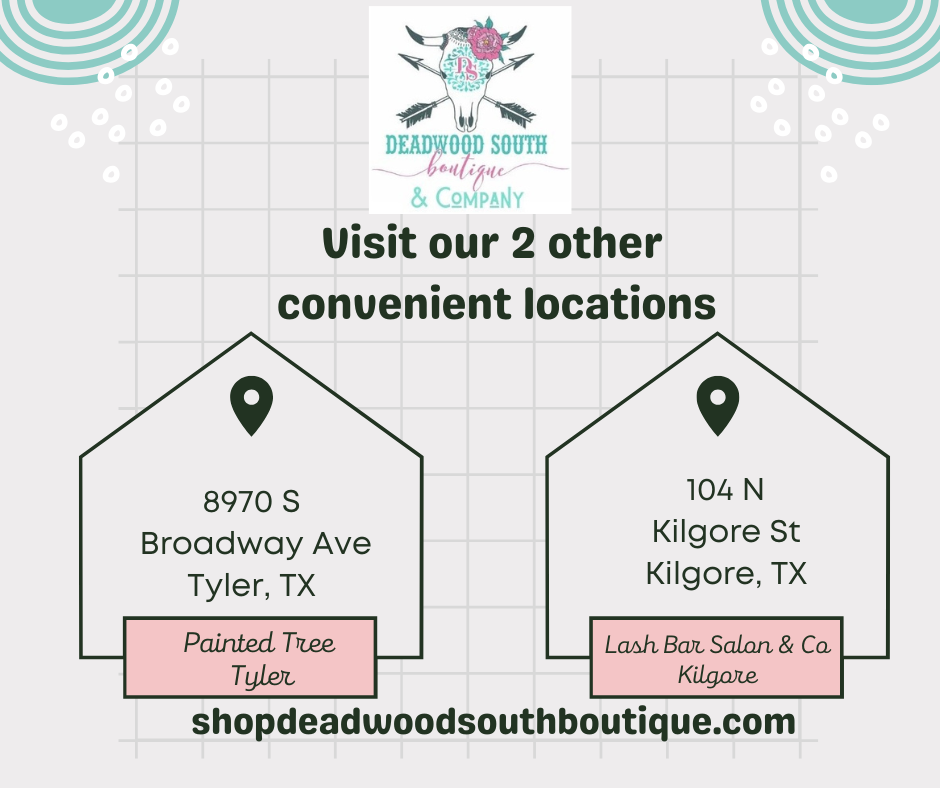 Can't make it to our main location, stop by one of our additional locations in Tyler or Kilgore, or shop 24/7 at shopdeadwoodsouthboutique.com.