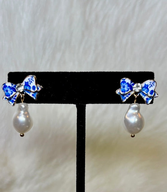 Add a touch of charm to your look with these Grace Bow Earrings featuring delicate blue floral details and a chic fashion pearl. Perfect for playful days and stylish nights, they bring a sweet, feminine vibe to any outfit.