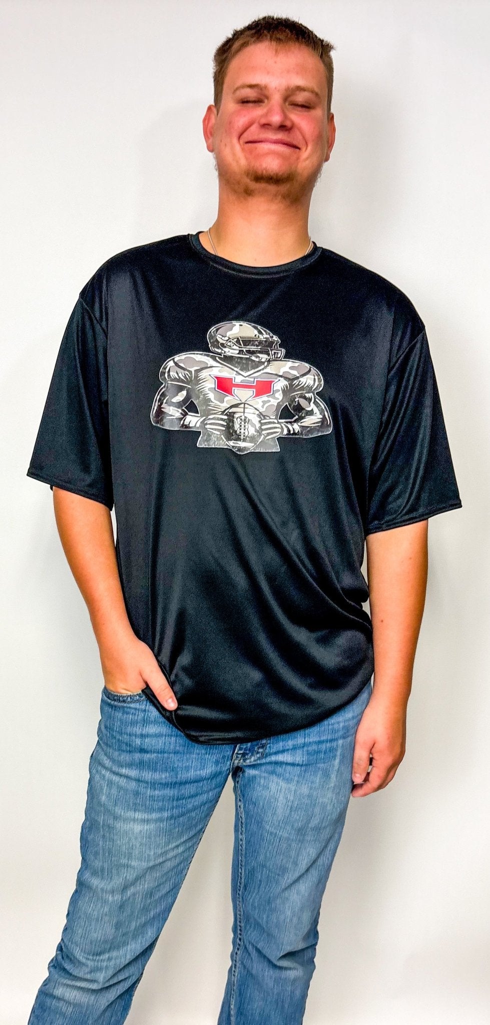 Get ready to play hard and stay cool in The Player Black Performance Tee. This dri-fit tee features a bold camo football player graphic, blending sporty style with unbeatable comfort. Perfect for game day or everyday hustle, it keeps you dry and looking sharp while you tackle your day.