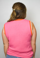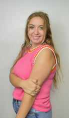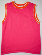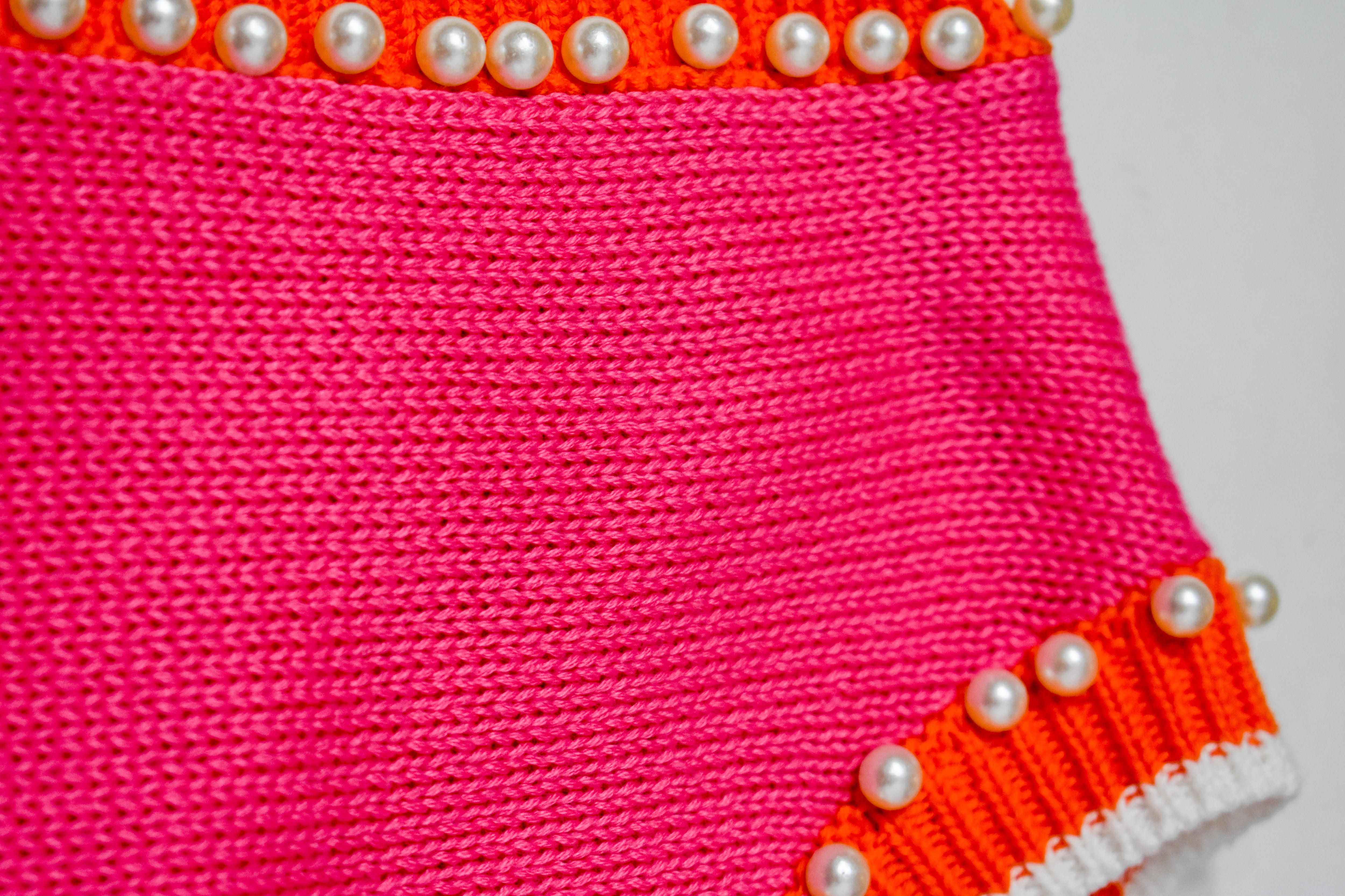 Elevate your layering game with The Pearl Lined Sweater Vest, featuring a sophisticated pink base accented by striking orange and white trim. This expertly crafted vest is uniquely lined along the edges with delicate pearls, combining classic elegance with modern style. Perfect for adding refined texture and color contrast, it pairs effortlessly with both casual and dressier outfits, offering a distinctive statement piece for your wardrobe.