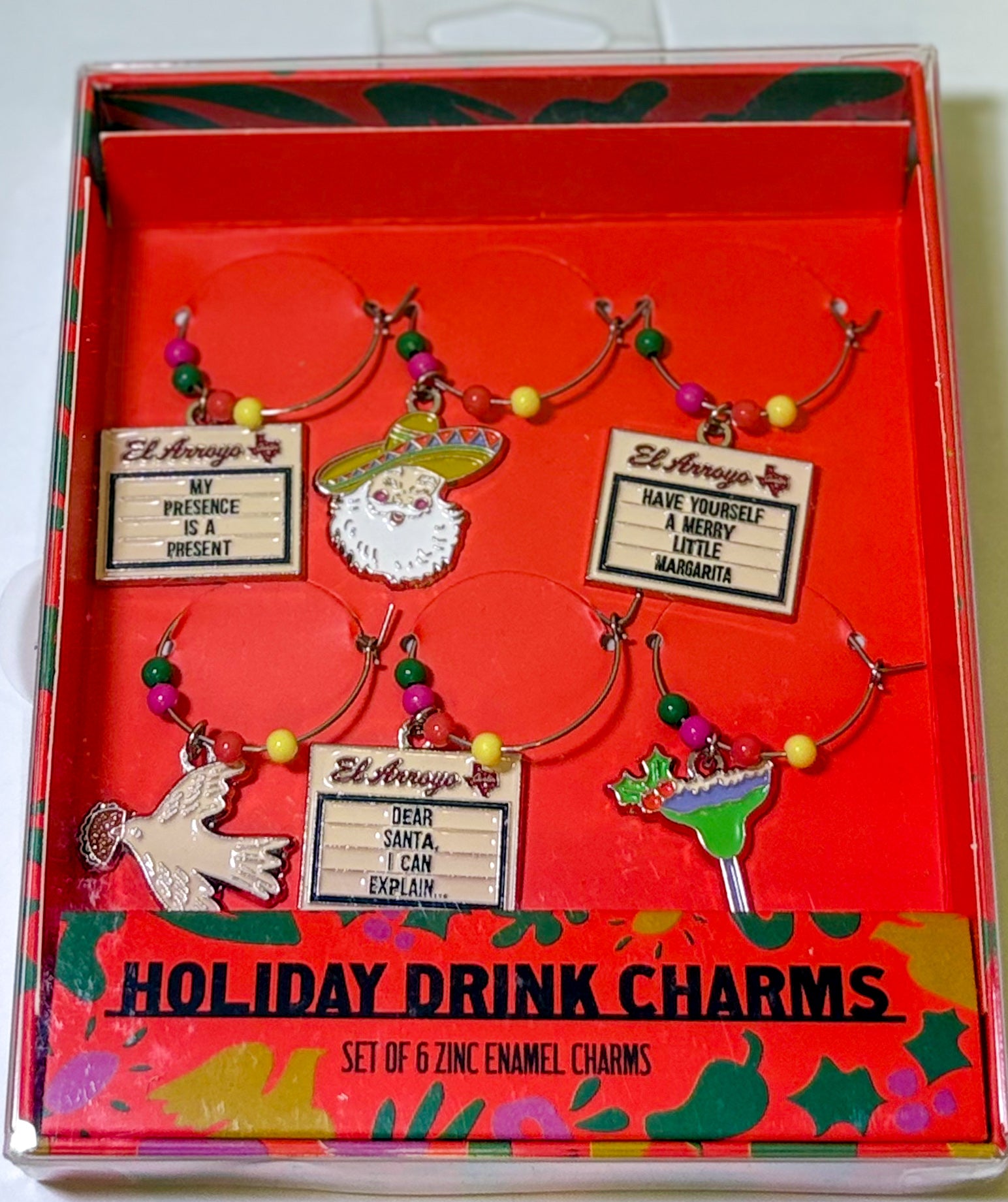 Add instant fun to your holiday gatherings with our El Arroyo Holiday Drink Charms Set! This playful collection features 3 festive marquee signs and 3 cheeky tex-mex icons that clip onto your glass to keep drinks identified and conversations laughing. Perfect for parties, these charming markers prevent the dreaded drink mix-up while letting your personality shine. Whether you're hosting a fiesta or casual get-together, these witty little accessories transform ordinary sips into memorable moments. Keep your drink safe, your style sharp, and the laughs flowing all season long.
