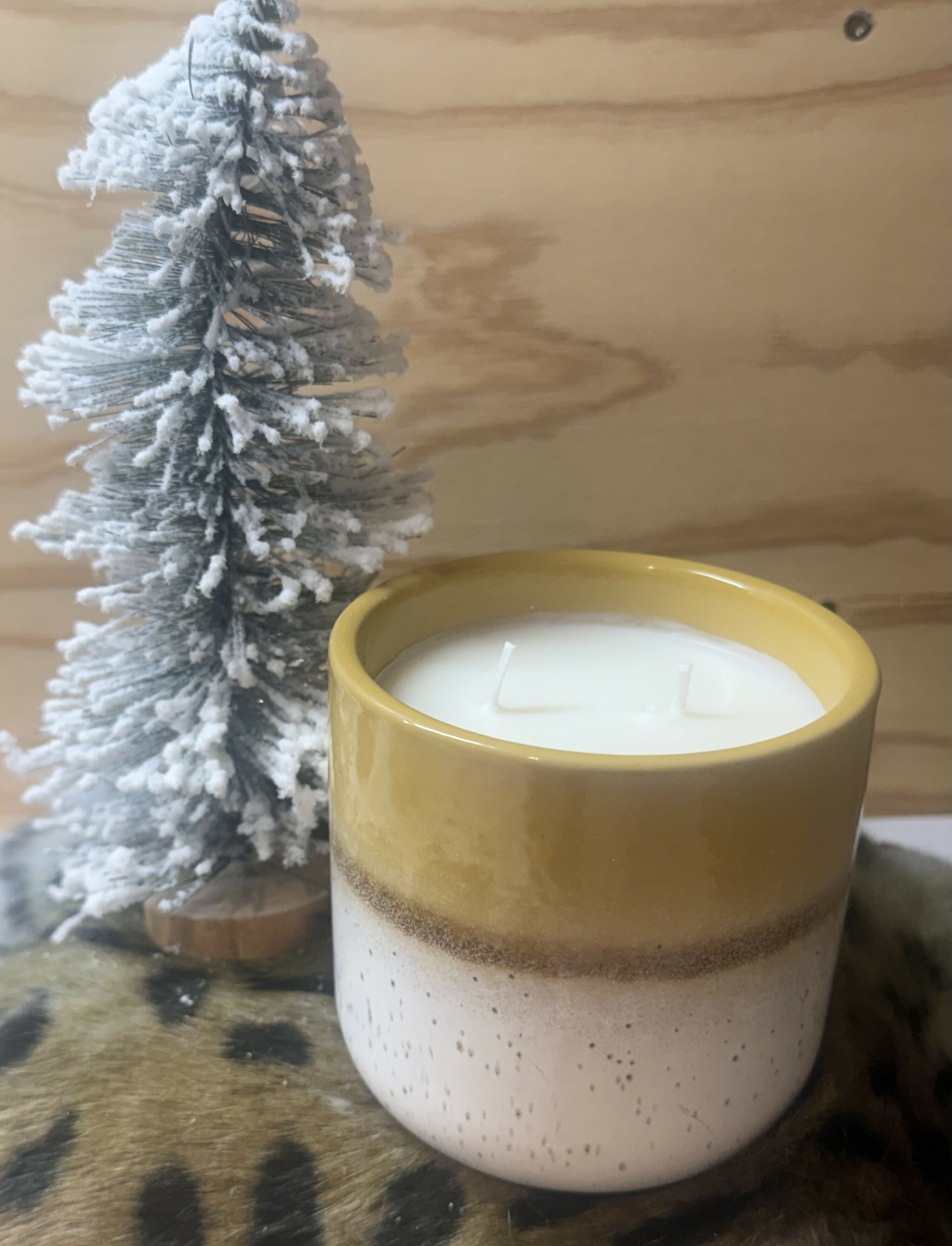 Leather scent candle in a gold and ivory speckled pottery dish.
