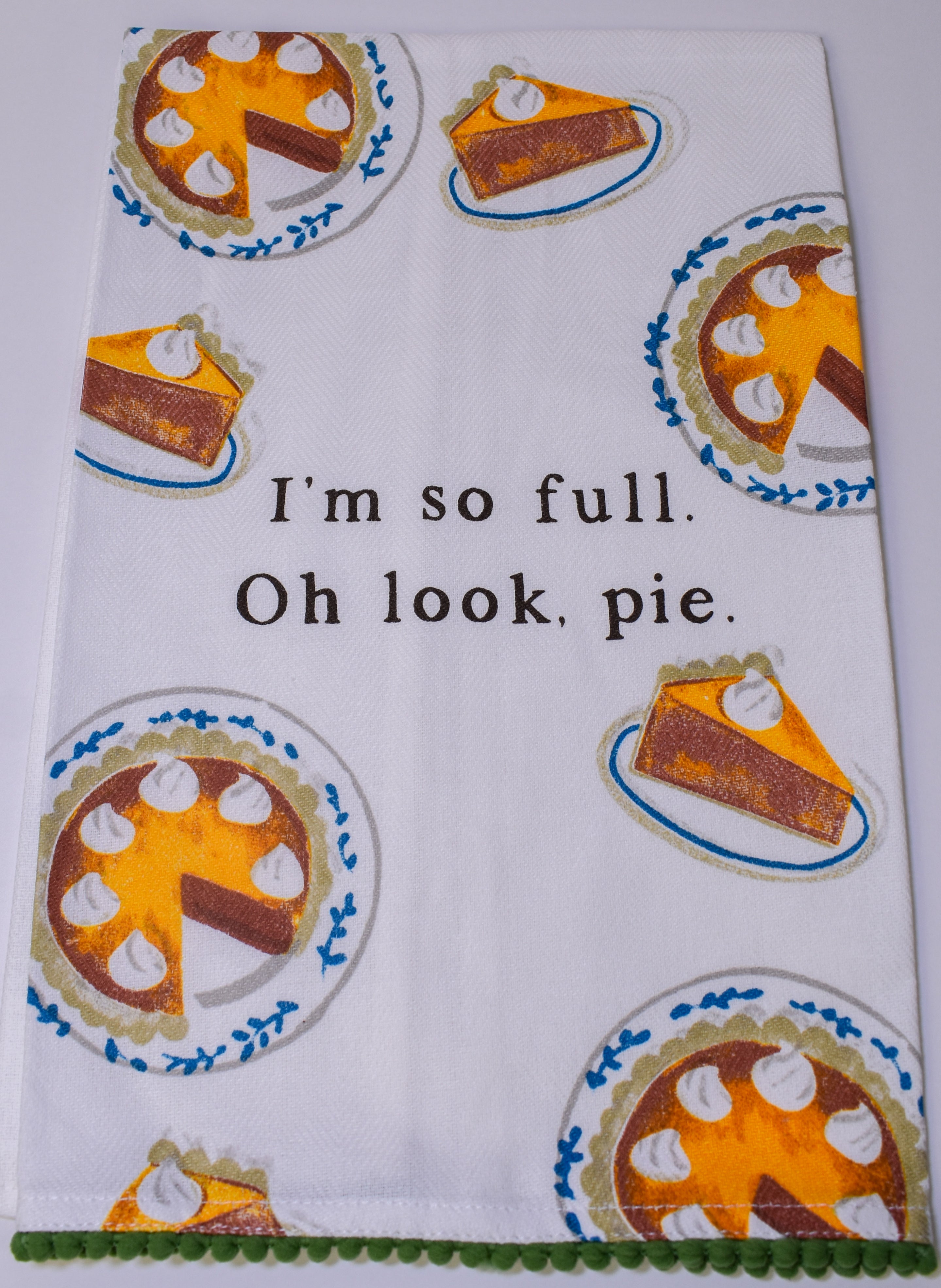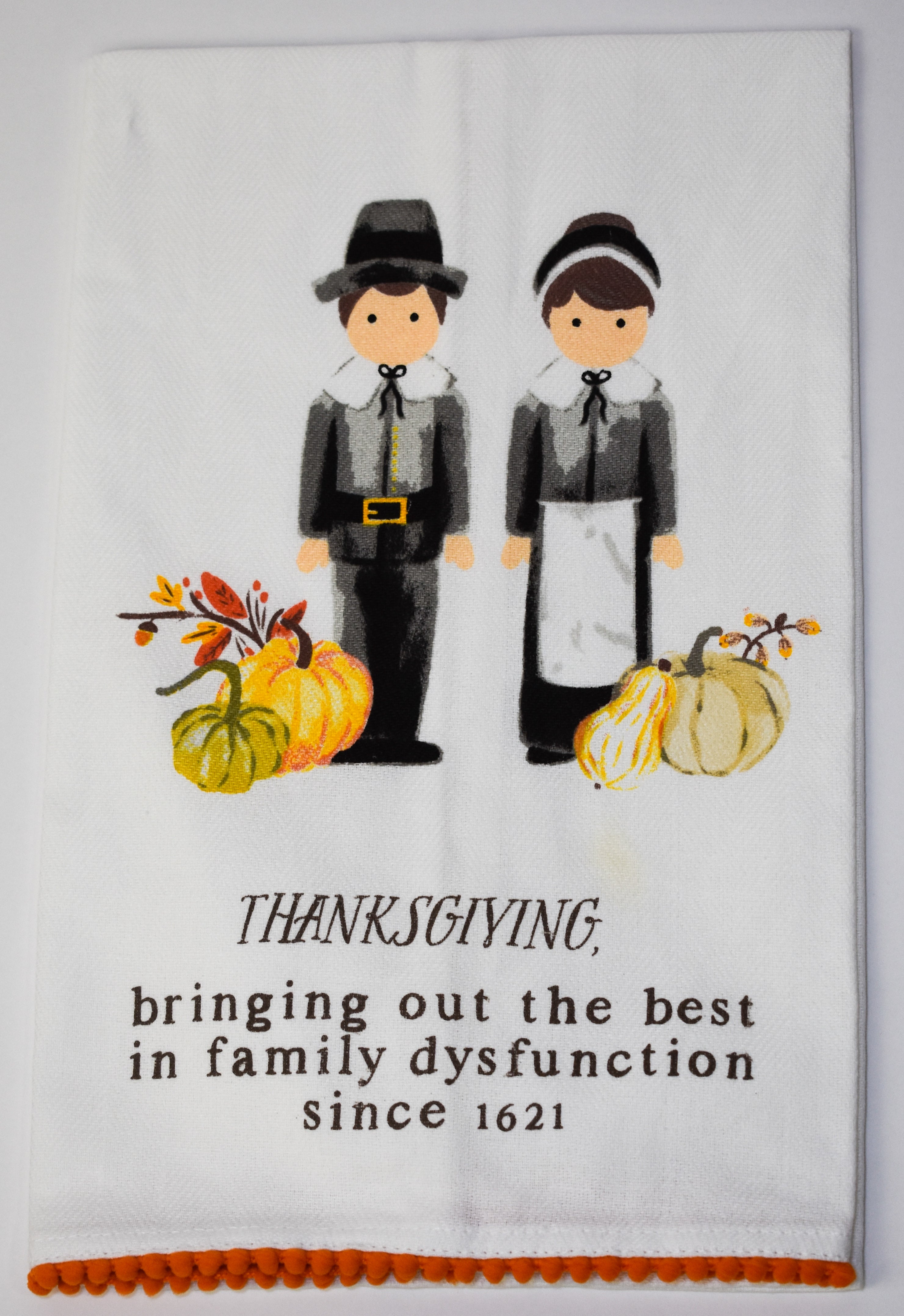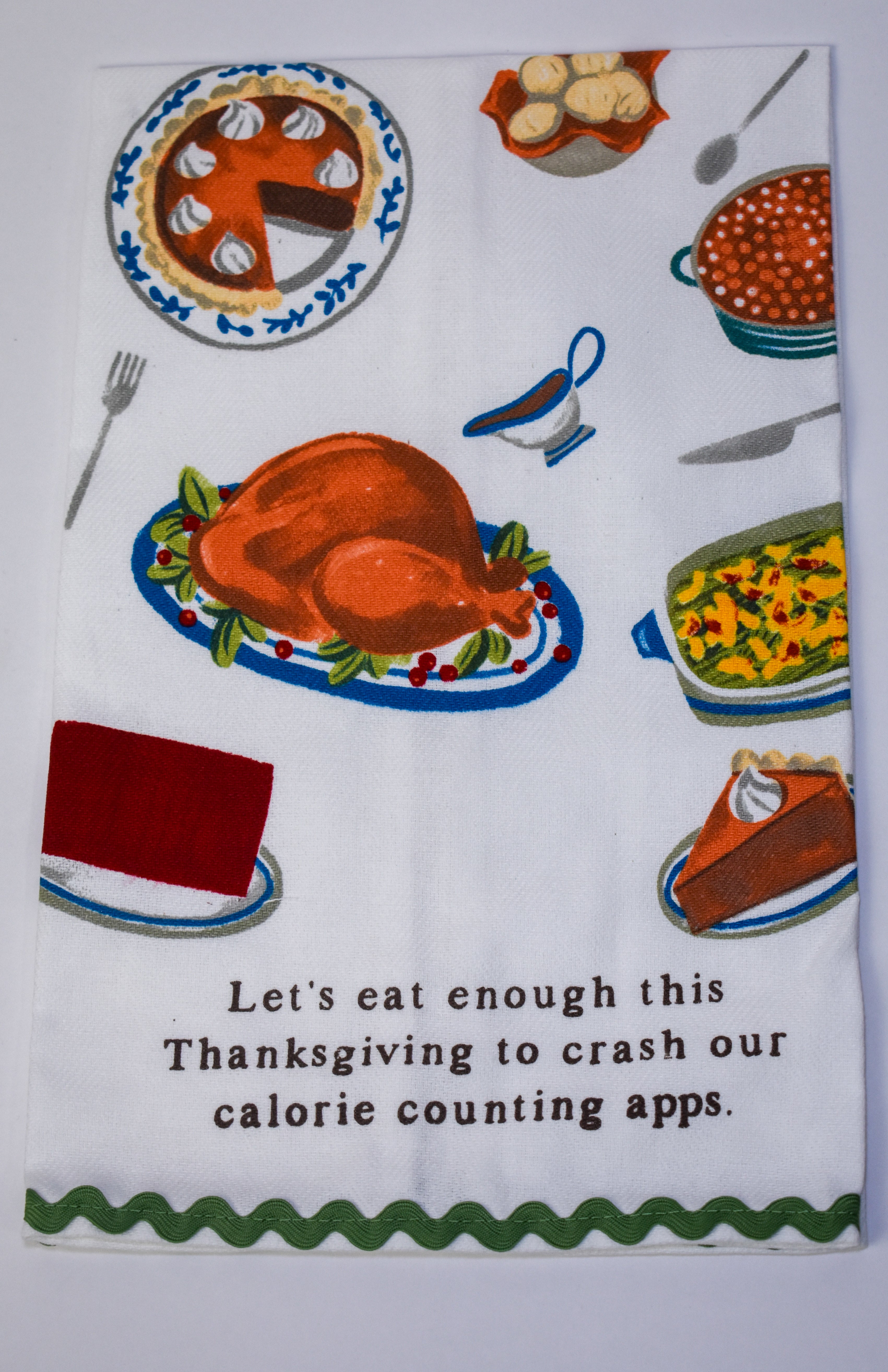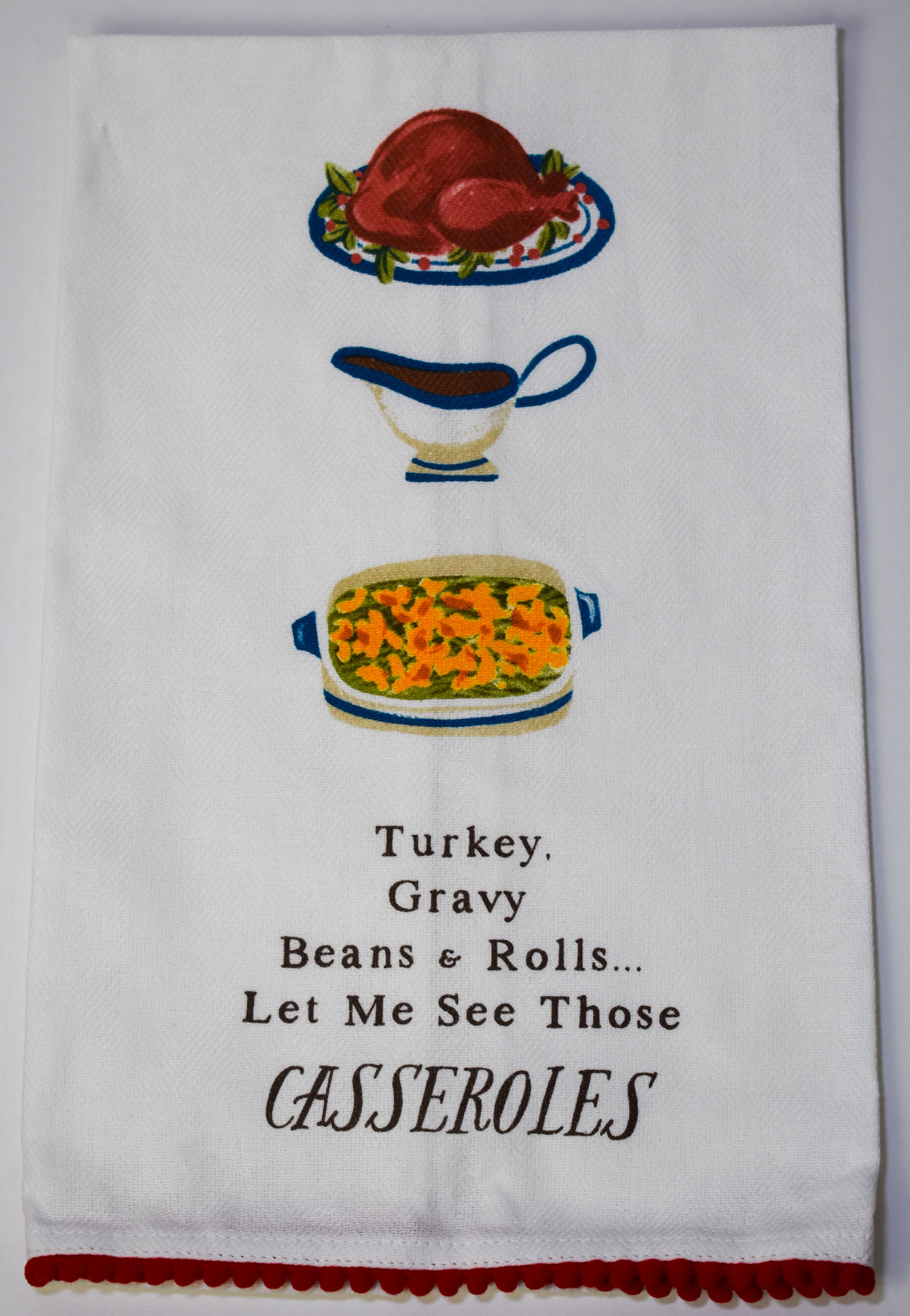 Add a touch of festive fun to your kitchen with the Mud Pie Thanksgiving Towels. Made of 100% cotton, these 26" x 16½" hand towels feature a charming mini pom hem and playful designs like calorie, casserole, cranberry, family dysfunction, leg day, and oh look pie. Soft and absorbent, they’re perfect for cleaning up or drying hands while keeping the holiday spirit alive. Easy to care for—just machine wash cold, line dry, and iron on the reverse side. Celebrate the season with a towel as lively as your Thanksgiving table!