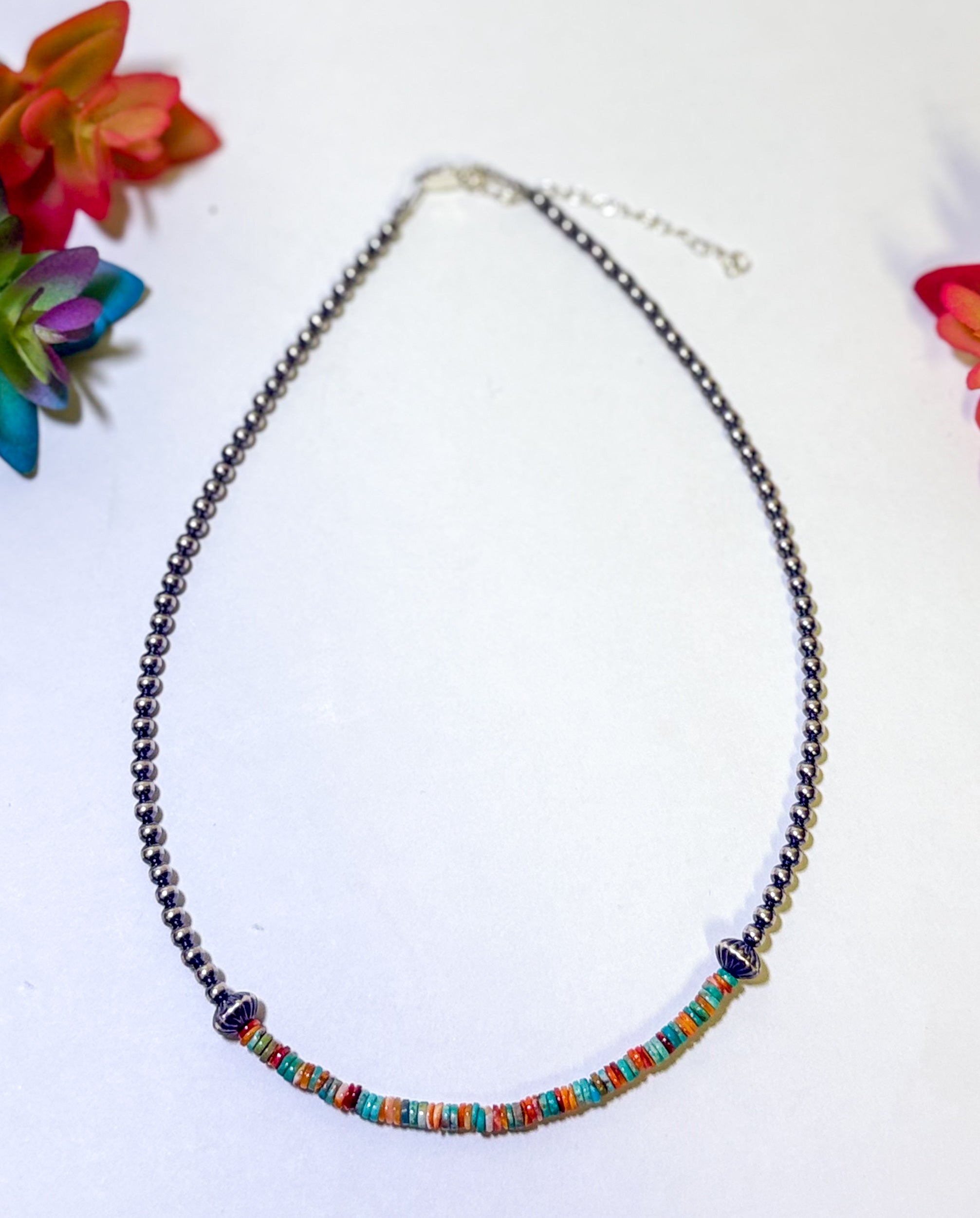 This playful 14-inch choker shines with 3mm sterling silver pearls and saucer accents, centered around a vibrant mix of turquoise-dominant heishi beads and a touch of spiny oyster. Inspired by sky and sea hues, it captures cool summer vibes perfectly. Adjustable with a 2-inch extender and secured by a sterling silver lobster clasp, it’s designed for a comfortable fit. Handmade in North Texas by The Bijoux FAB, this choker combines quality craftsmanship with eye-catching style for your everyday sparkle.