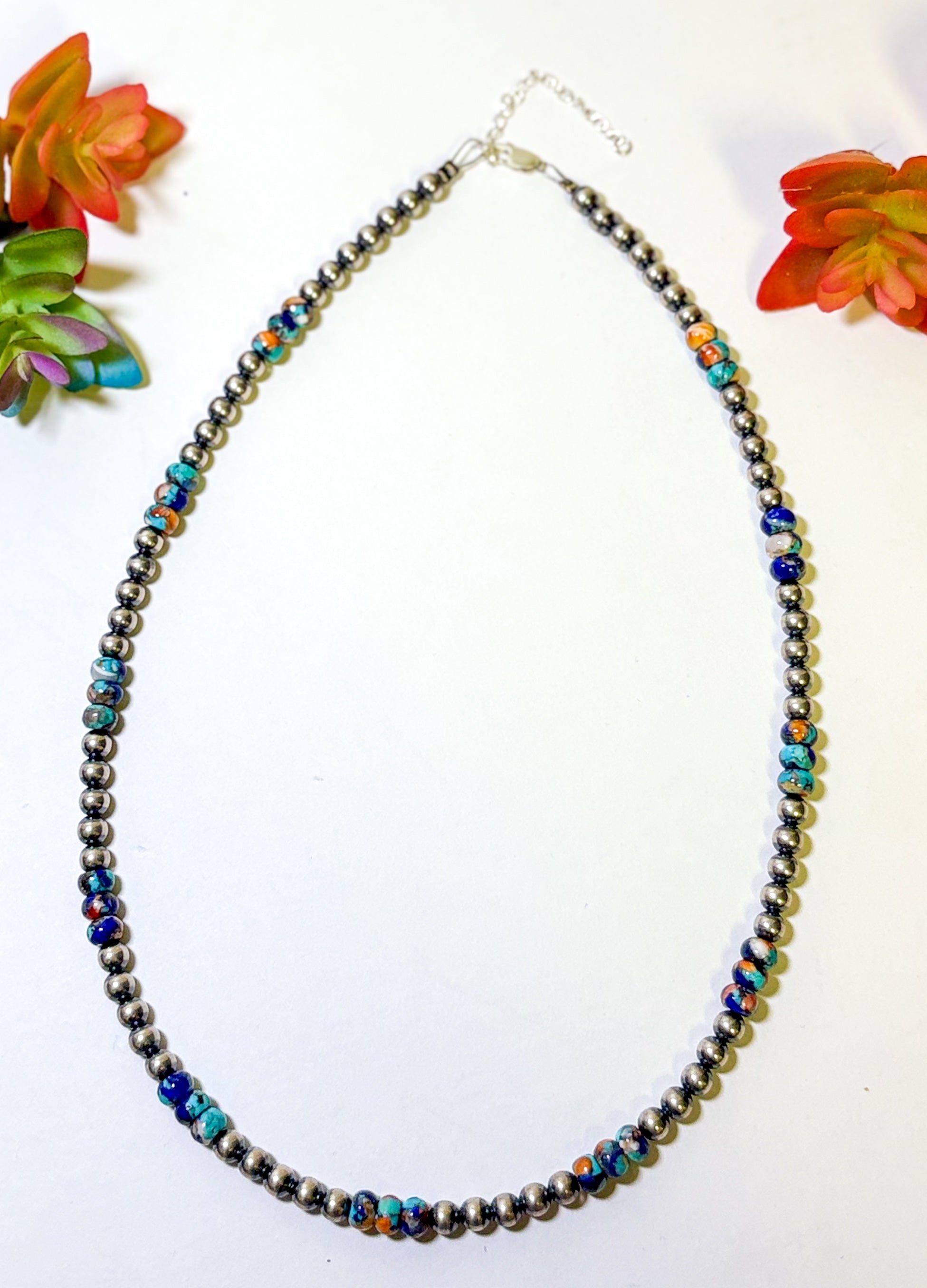 Add a touch of whimsy to your look with this 18-inch sterling silver pearl necklace, featuring delicate 5 mm pearls and playful 6 mm beads. The rare lapis stone, spiny accents, and turquoise rondelle beads bring a fun, colorful mix that’s perfect for mixing and matching. A 3-inch chain extension lets you adjust the length to fit your mood and outfit!