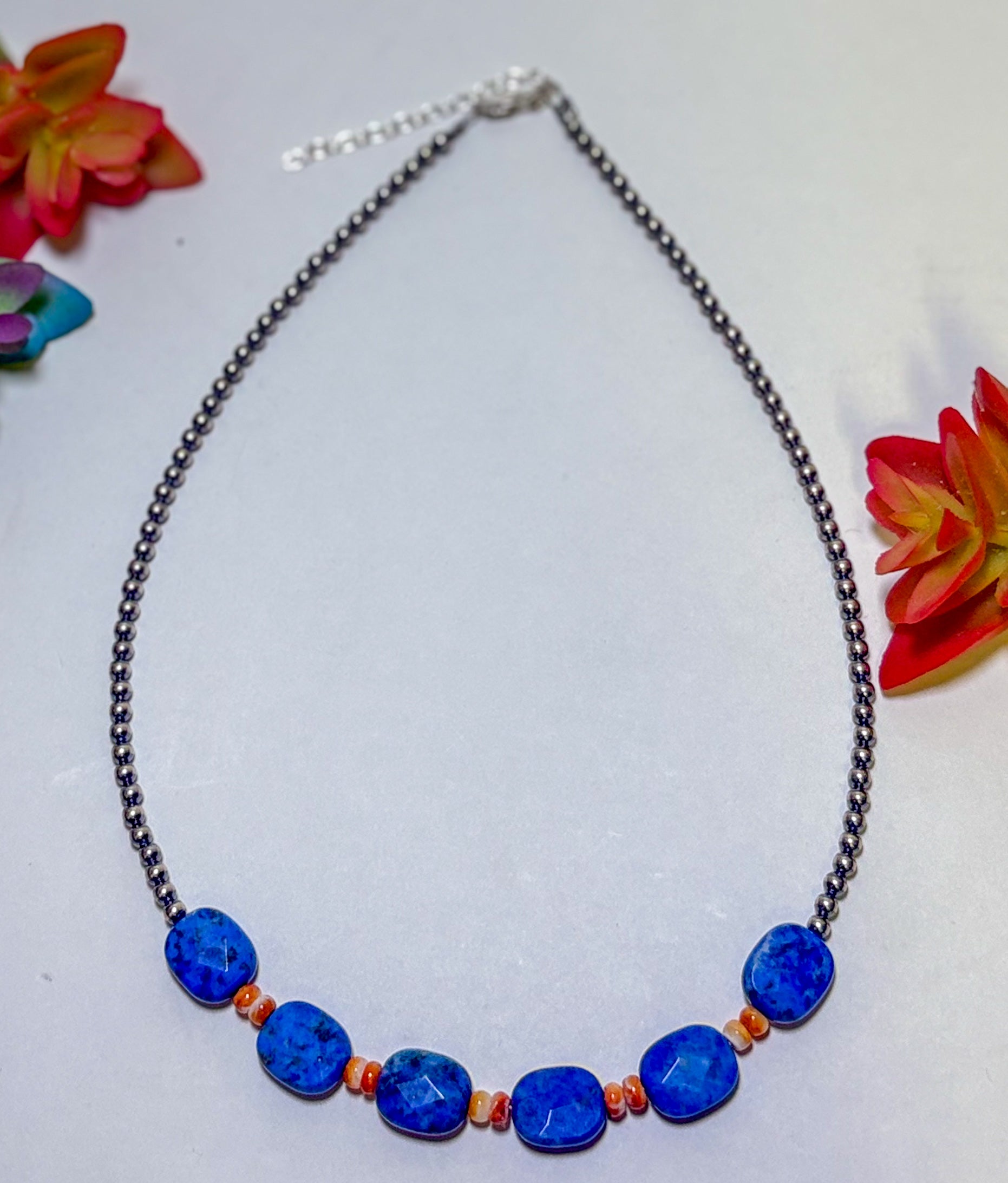 Add a splash of sunny charm to your look with this playful choker featuring delicate 3mm sterling silver pearls and vibrant round spiny oyster beads in a lively orange hue. Faceted rectangular lapis beads add a cool contrast, making it the perfect necklace to brighten your summer style. Handcrafted in North Texas, this lightweight 14-inch adjustable piece layers effortlessly or shines solo, secured with a comfy clasp for all-day wear. Embrace bold color and easy elegance in one fun, wearable statement made proudly in the USA by The Bijoux FAB.
