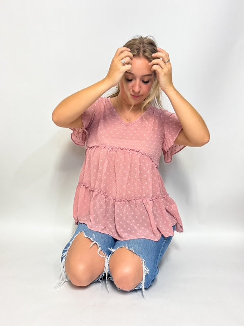 This playful Swiss dot babydoll top brings a fresh, flirty vibe with its delicate textured fabric and tiered layers. Featuring short sleeves and a flattering v-neckline, it’s perfect for adding a touch of whimsy to your everyday look. Light and breezy, it pairs effortlessly with your favorite jeans or skirts for a fun, feminine style.
