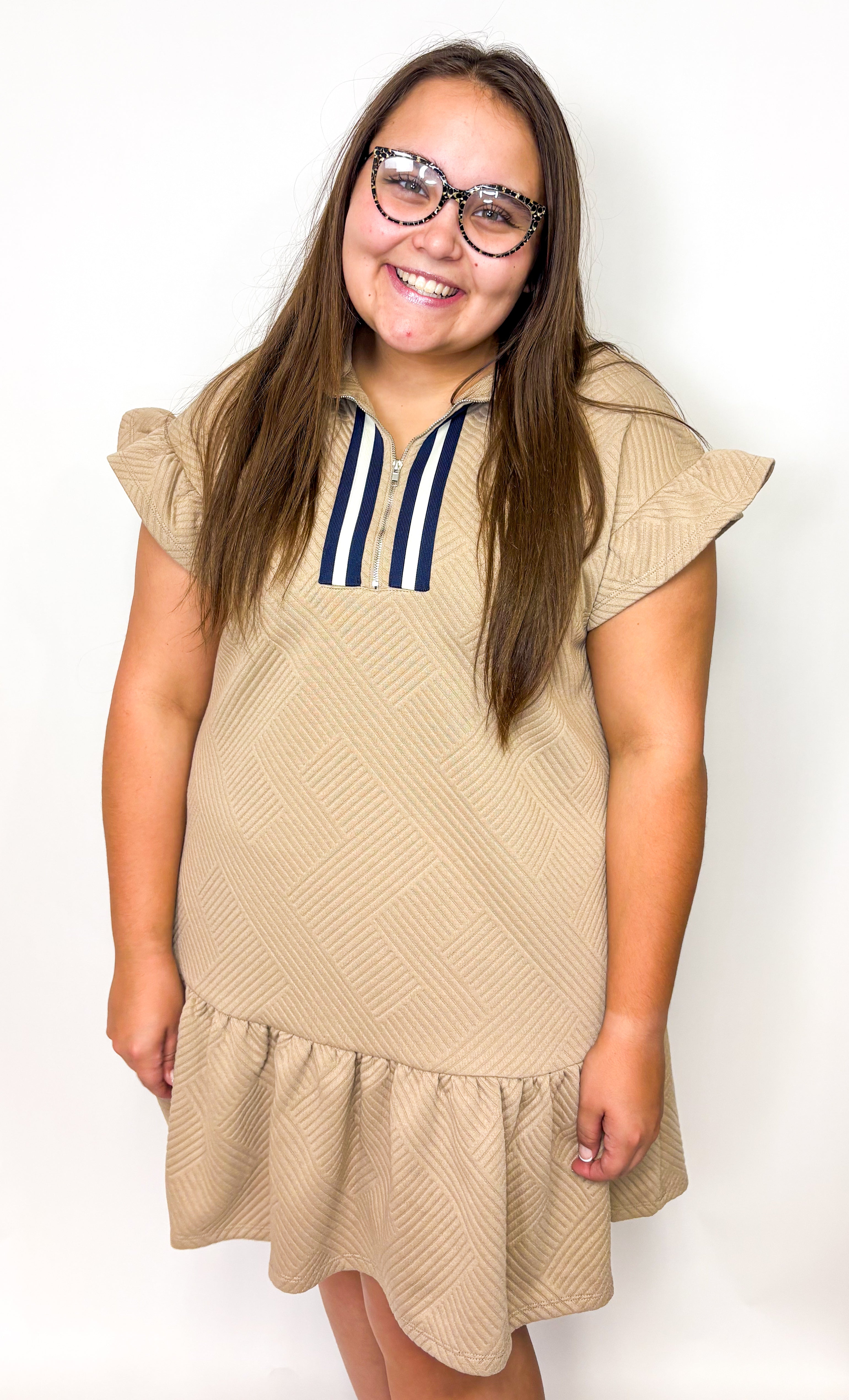 The Quilted 1/2 Zip Mini Dress features playful ruffle sleeves and charming quilted details for a stylish twist. Made from 100% polyester, this dress offers a cozy feel with a fun, flirty vibe—perfect for turning heads wherever you go.
