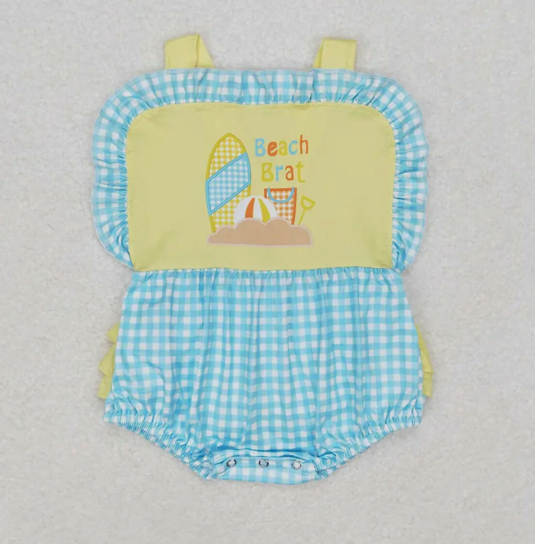 Beach Blue Checkered Romper w-ruffle on back