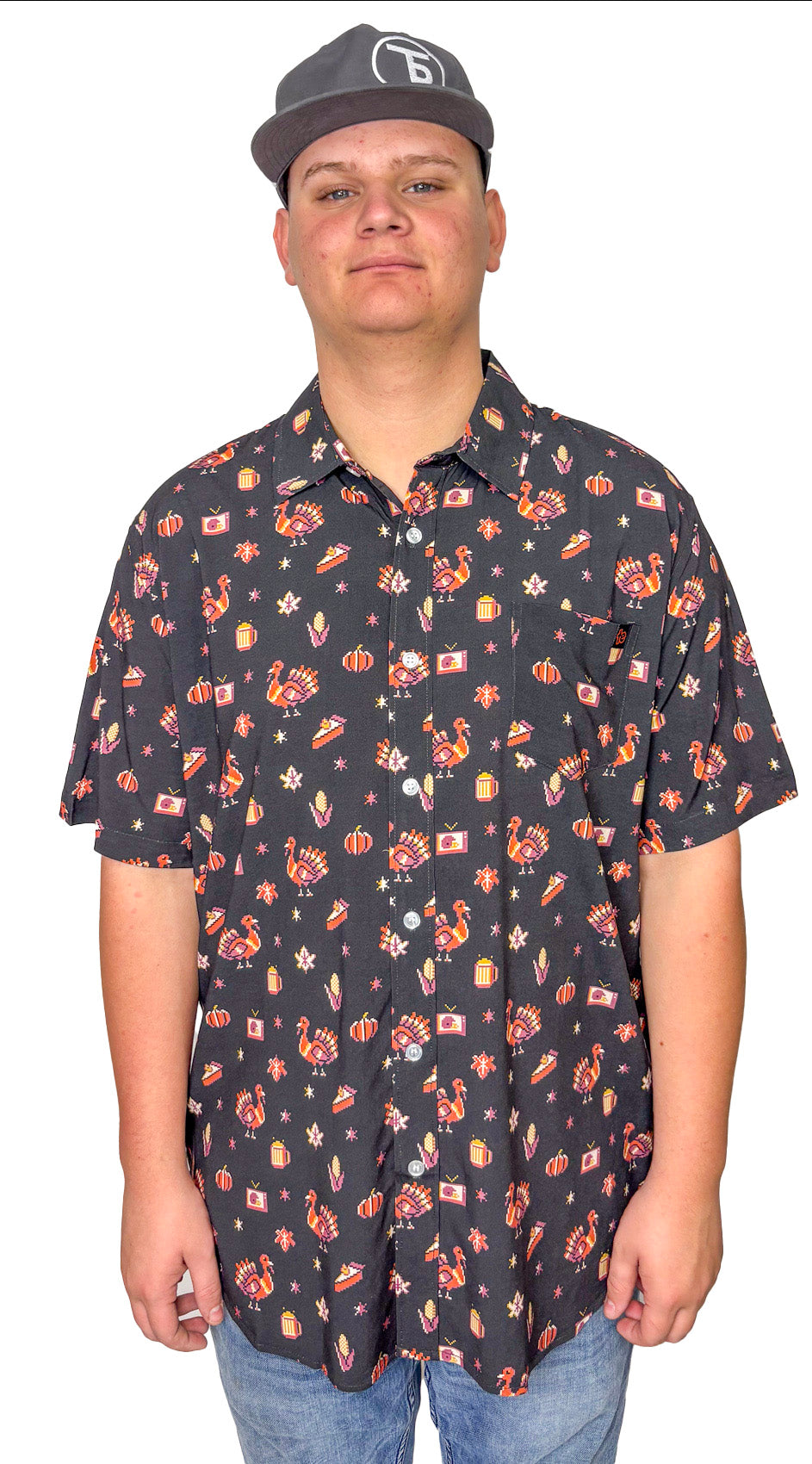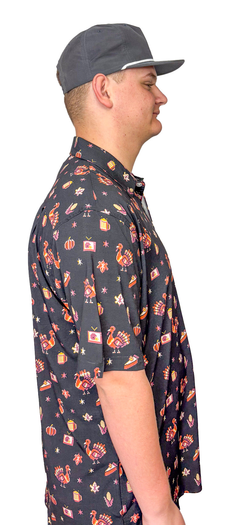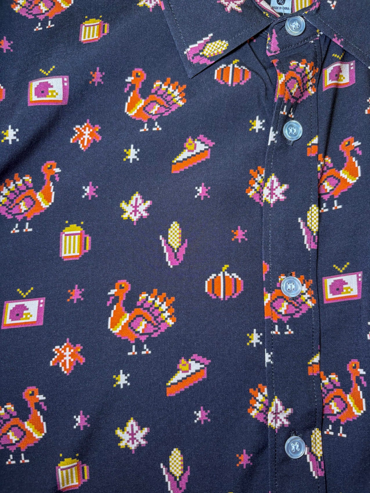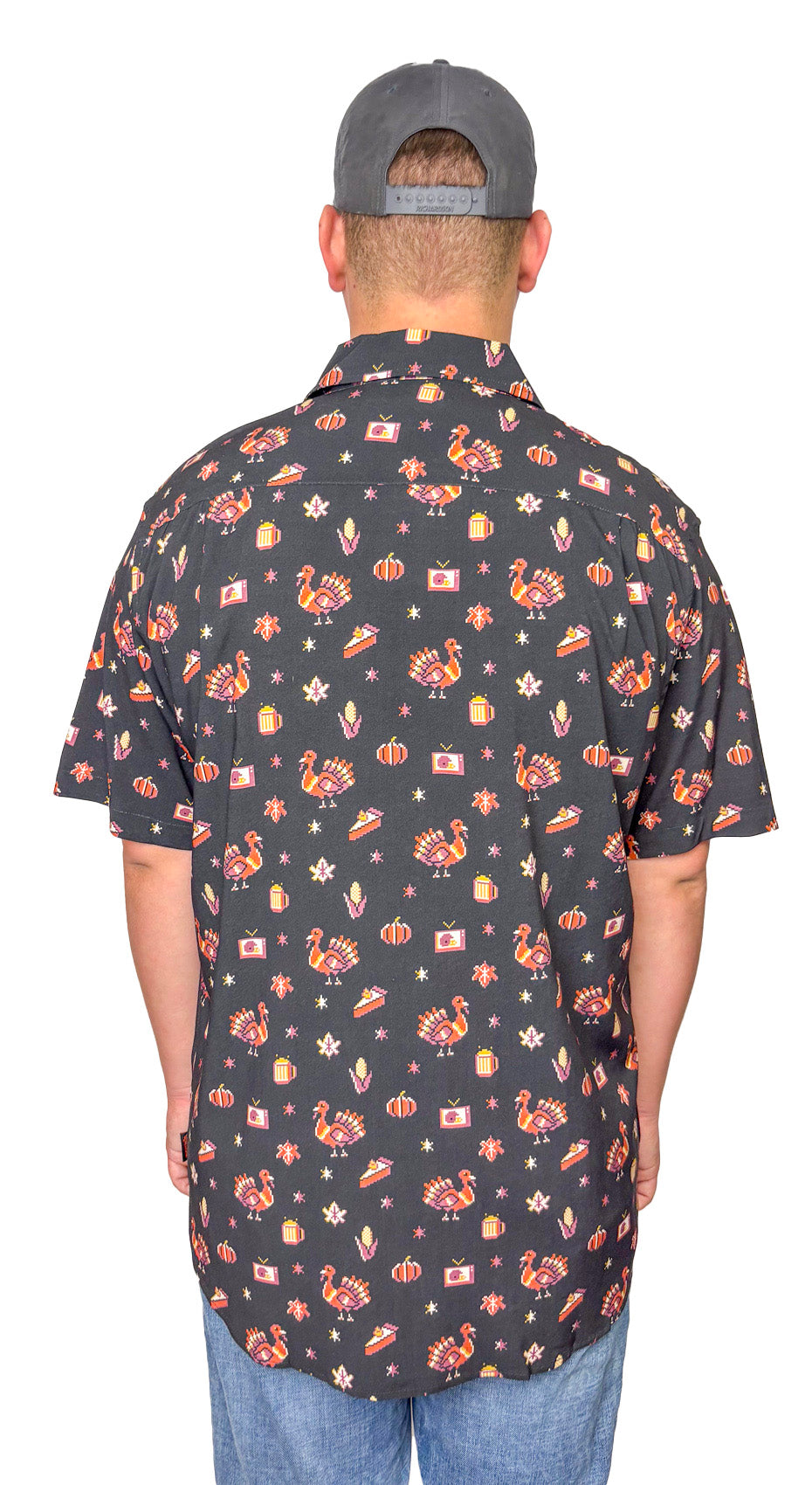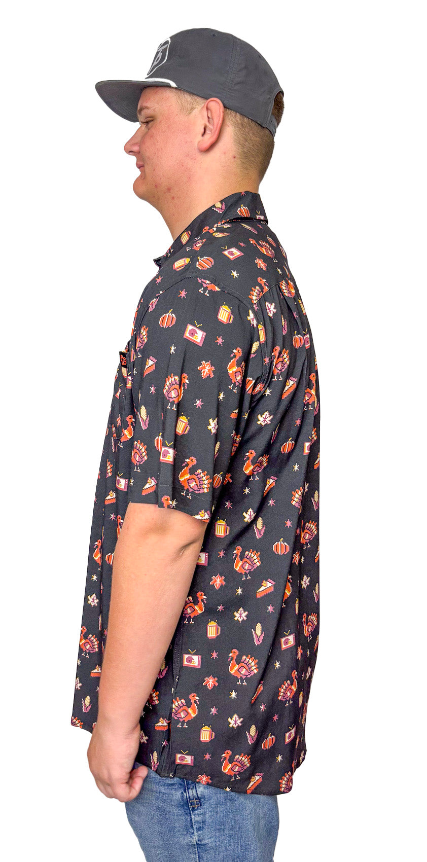 Gobble up style this season with our Men's 8-Bit Turkey Button Down Shirt! Perfect for Thanksgiving gatherings, football watch parties, and holiday celebrations, this playful tee features retro pixel art turkeys, pumpkins, and all your favorite fall favorites in classic 8-bit gaming style. Whether you're carving pies, cheering on your team, or just embracing the season's spirit, this shirt brings nostalgic fun to your festive wardrobe. A must-have for any guy who loves gaming, Thanksgiving, and a good laugh.
