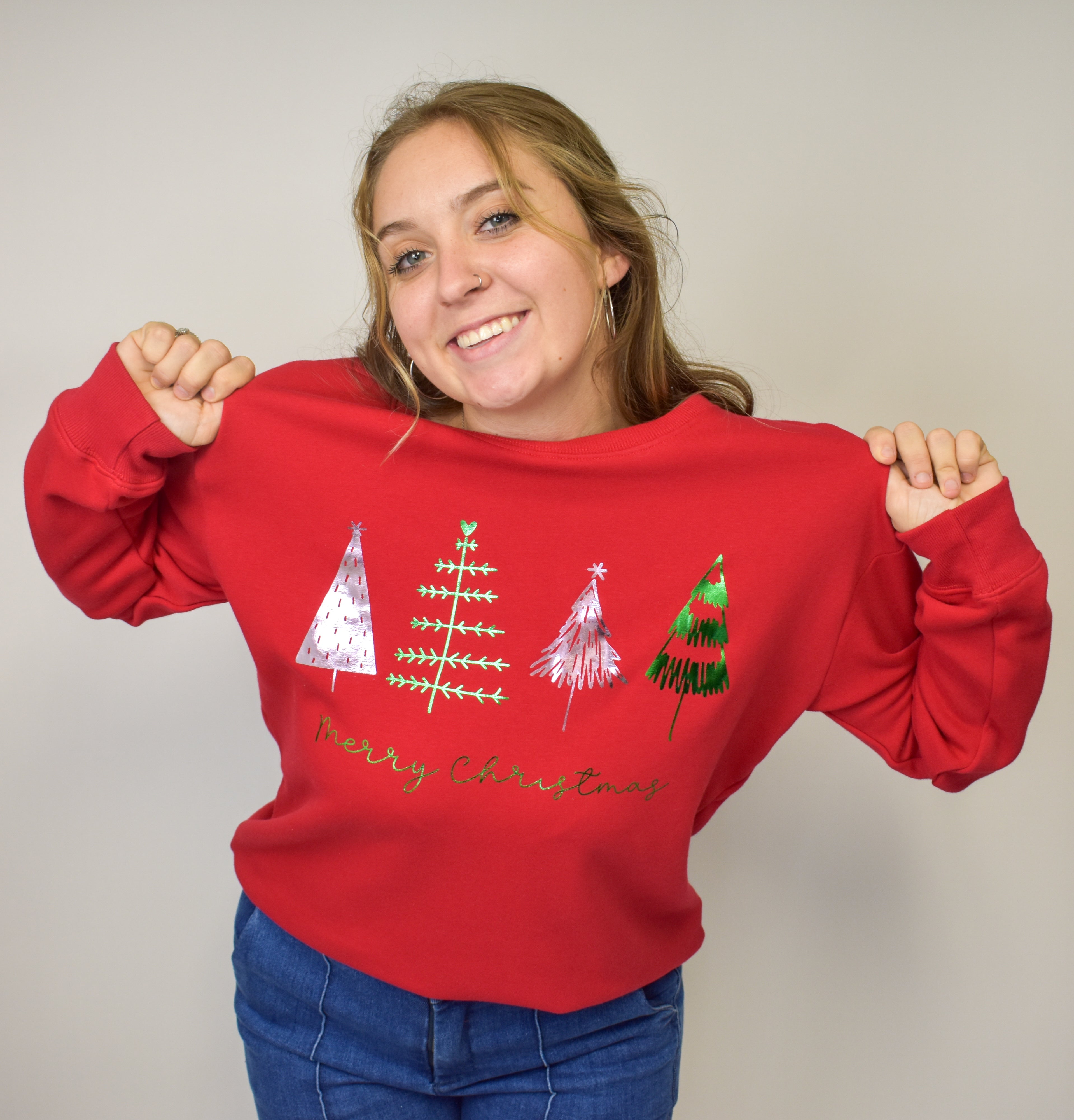 Celebrate the season in style with the Marigold Kisses Red Christmas Sweatshirt. Featuring shiny foil Christmas trees and a cheerful "Merry Christmas" message, this cozy sweatshirt adds a festive sparkle to your holiday wardrobe. Perfect for spreading joy and staying warm during chilly winter days, it’s your new go-to for holiday gatherings or cozy nights by the fire. Brighten up every celebration with a playful holiday vibe!