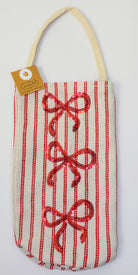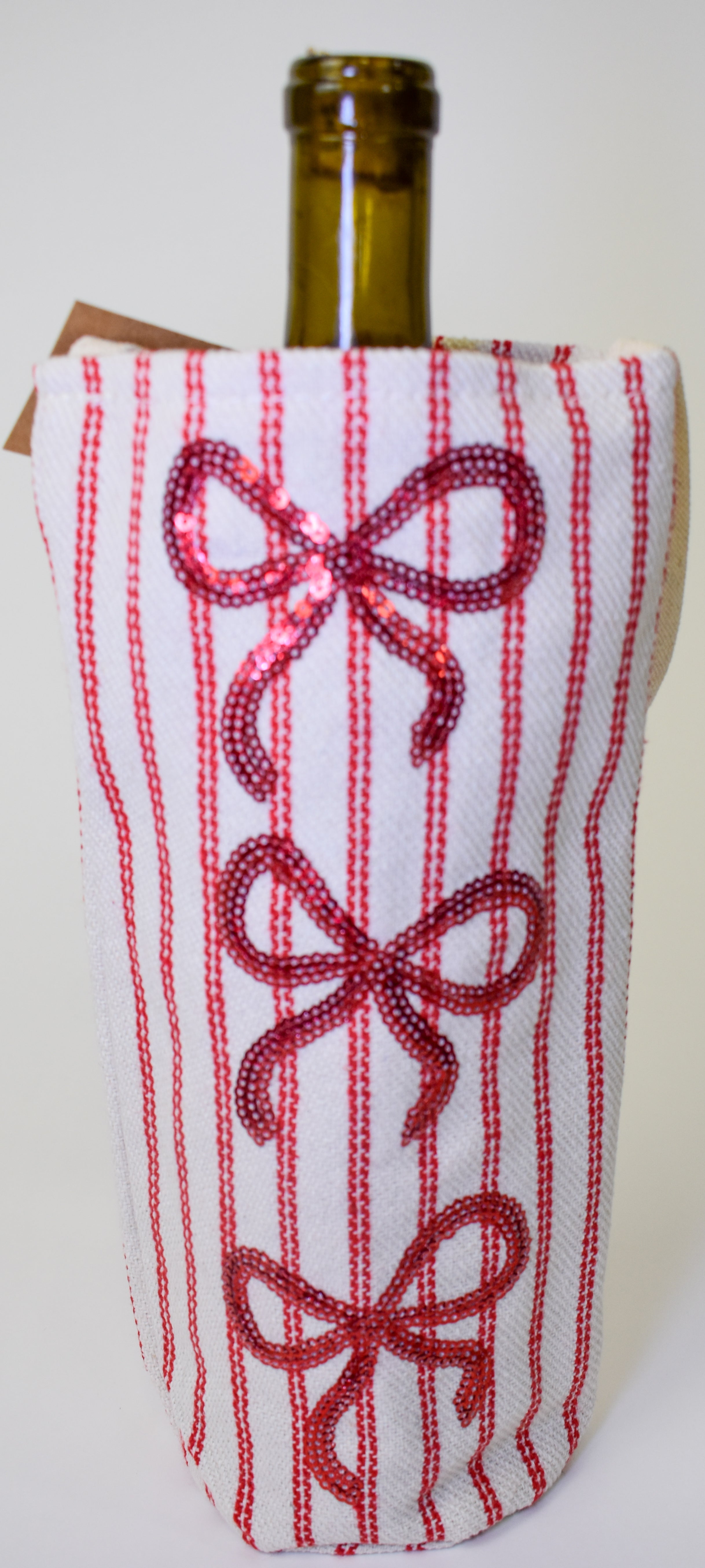 Expertly designed for any special occasion, the Mud Pie Sequin Wine Bag is a giftable must-have. Made with high-quality French ticking and adorned with elegant sequin icons, this 15" x 5" bag adds a touch of luxury to any wine bottle. Crafted from a blend of polyester, cotton, rayon, and nylon, it is durable and stylish for all your wine-gifting needs.