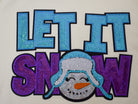 Bring the sparkle to sweater weather with this fun and festive cream-colored sweatshirt, featuring a bold and glittery “LET IT SNOW” graphic. The design pops with bright teal, purple, and blue glitter lettering, centered around an adorable sequined snowman face complete with a cozy winter hat and carrot nose. Eye-catching and playful, this sweatshirt is perfect for spreading holiday cheer wherever you go!