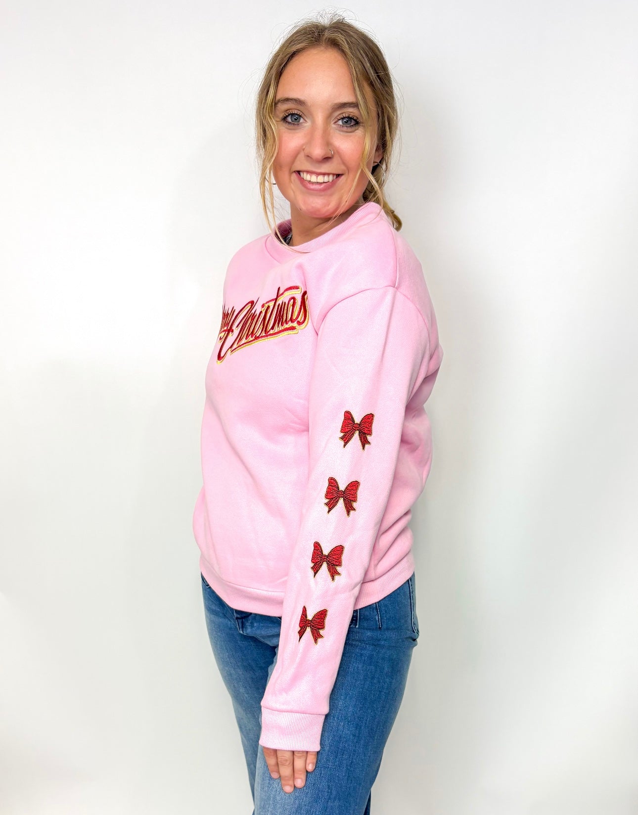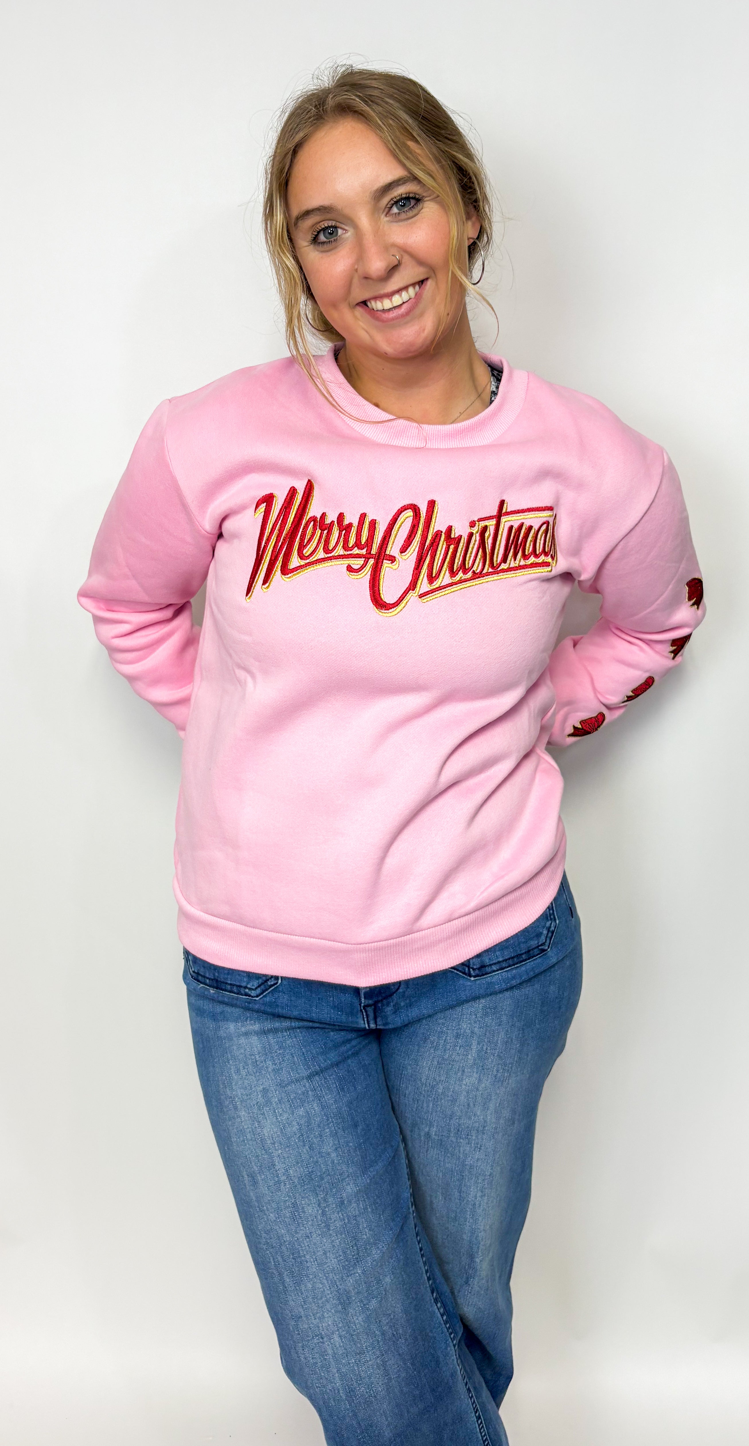 Celebrate the season in style with The Merry Christmas Bow Sweater. This playful pink sweatshirt features "Merry Christmas" beautifully embroidered across the front, accented by charming embroidered bows lining each sleeve. Cozy and festive, it’s perfect for spreading holiday cheer wherever you go.