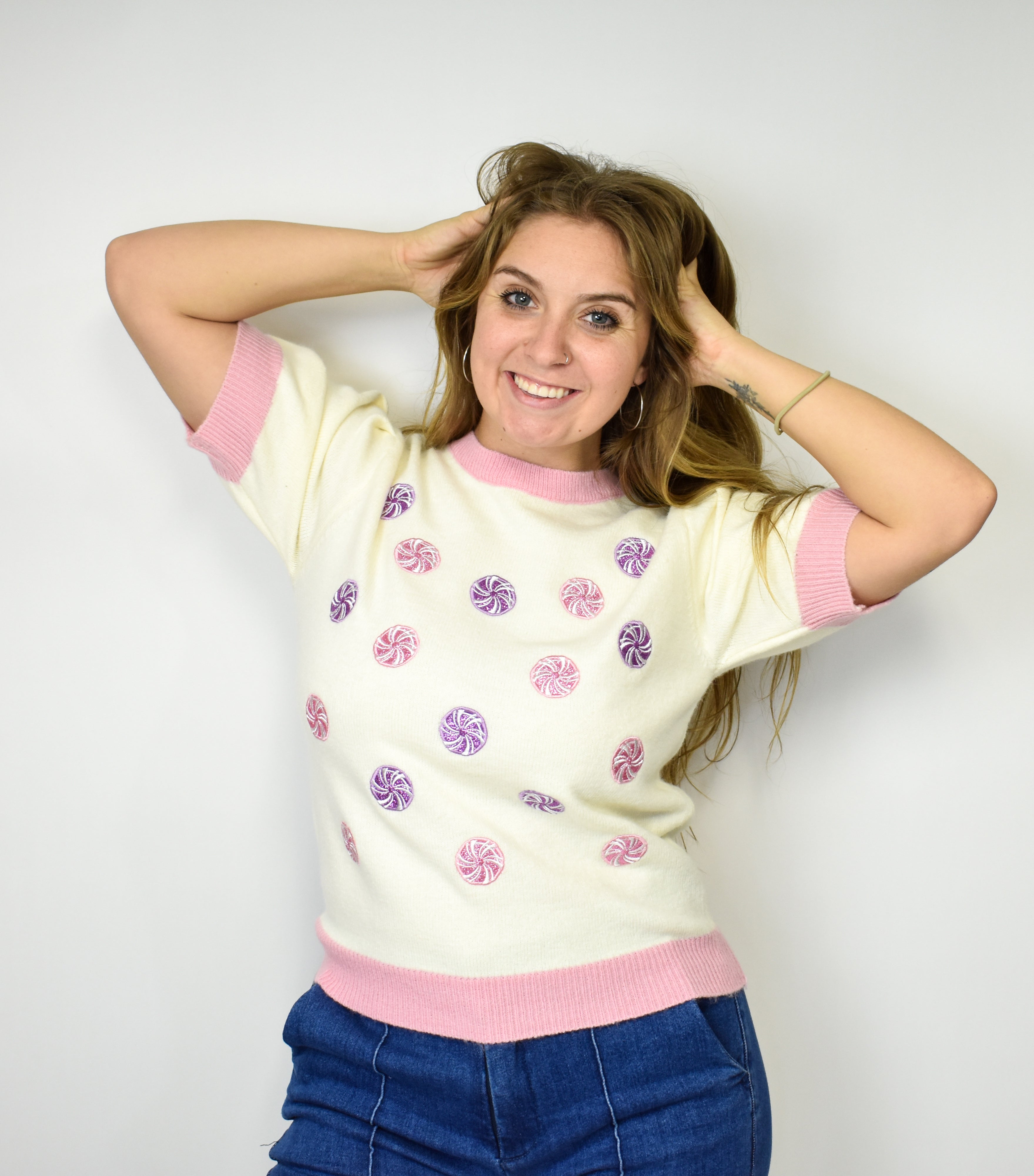 The Glitter Peppermint Sweater combines cozy softness with festive charm, featuring pink and purple glittered peppermint motifs that bring a subtle sparkle to your winter wardrobe. Accented with a delicate pink trim, this sweater offers a stylish yet comfortable fit, perfect for adding a touch of holiday spirit without sacrificing warmth or quality. Ideal for seasonal gatherings or casual wear, it balances unique design with expert craftsmanship.