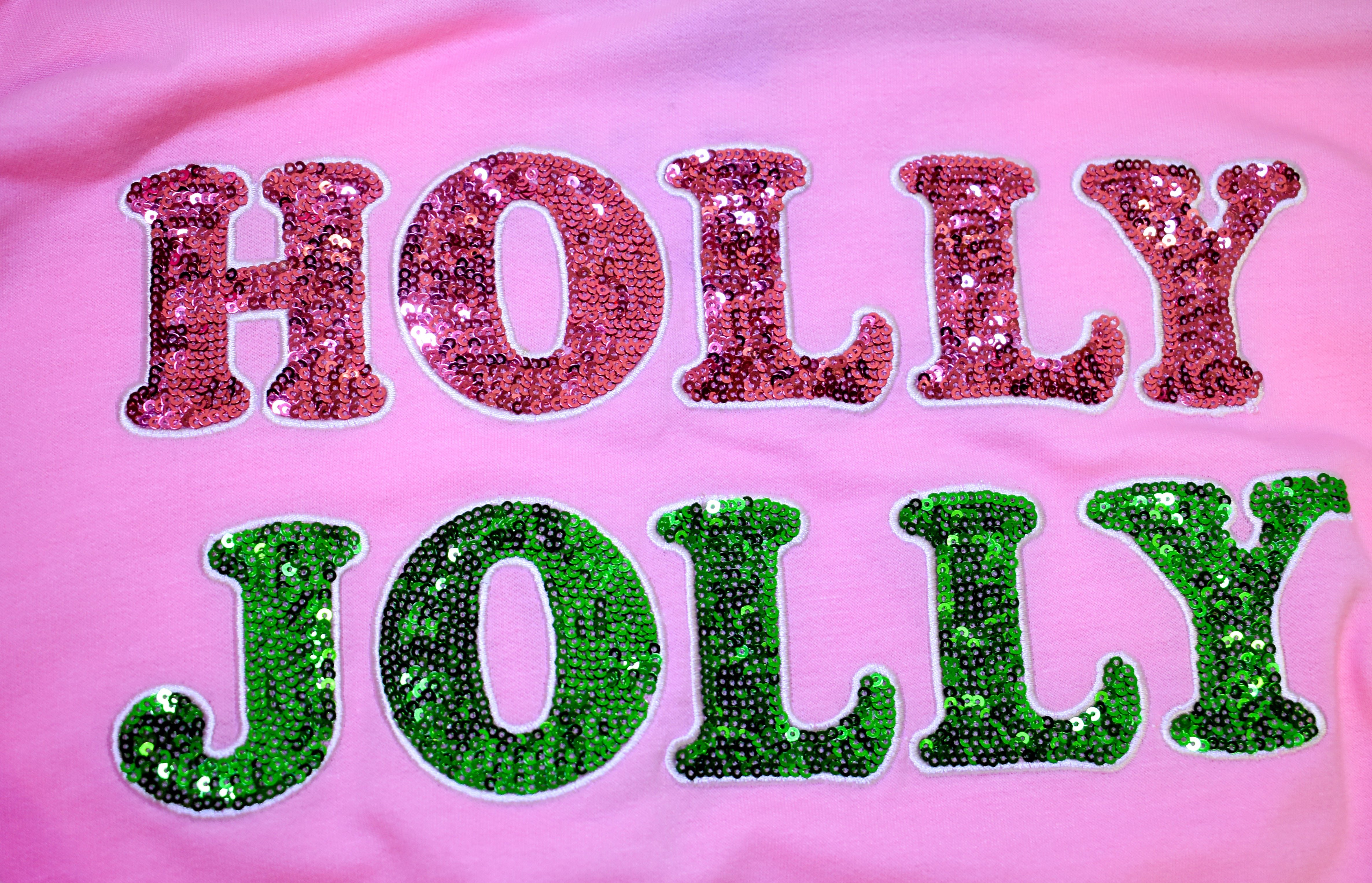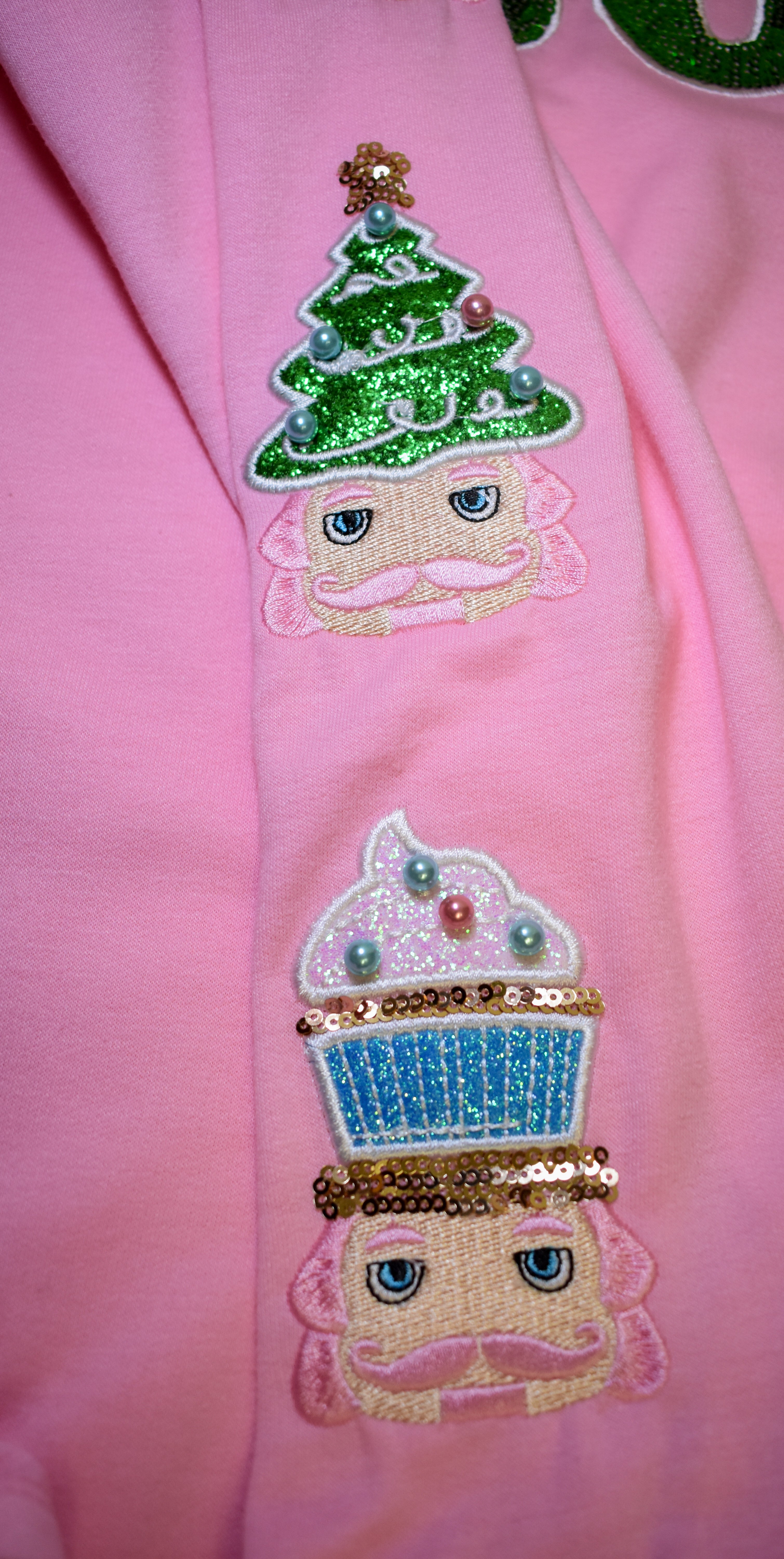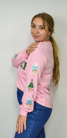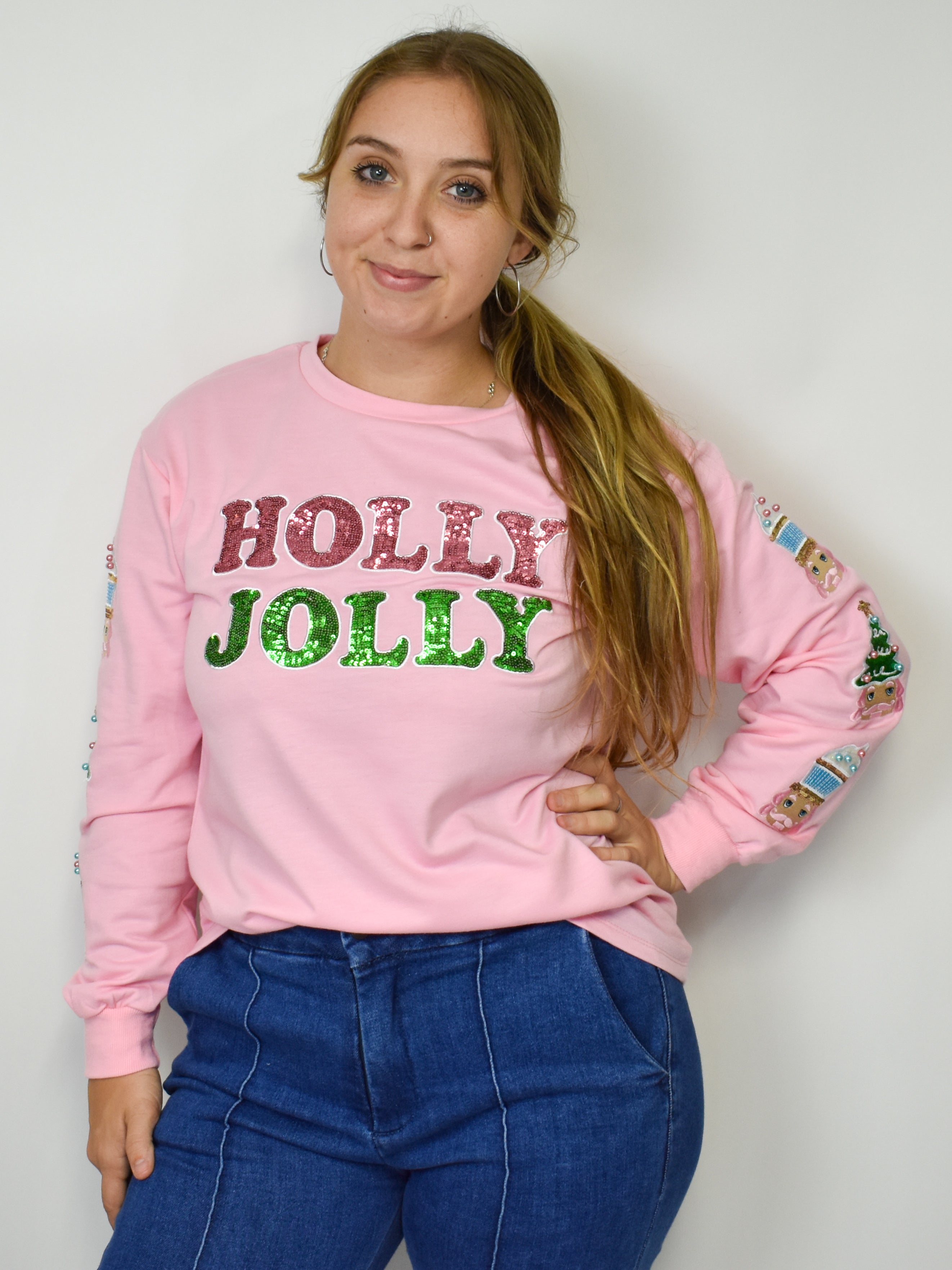 Celebrate the festive season in style with The Holly Jolly Sweatshirt. This pink sweatshirt features shimmering sequined "Holly Jolly" lettering that adds a touch of holiday sparkle. Nutcracker designs adorn each sleeve, bringing a classic seasonal charm to your cozy outfit. Perfect for holiday gatherings or casual winter wear, it combines comfort with distinctive festive details for a cheerful, expert-approved look.
