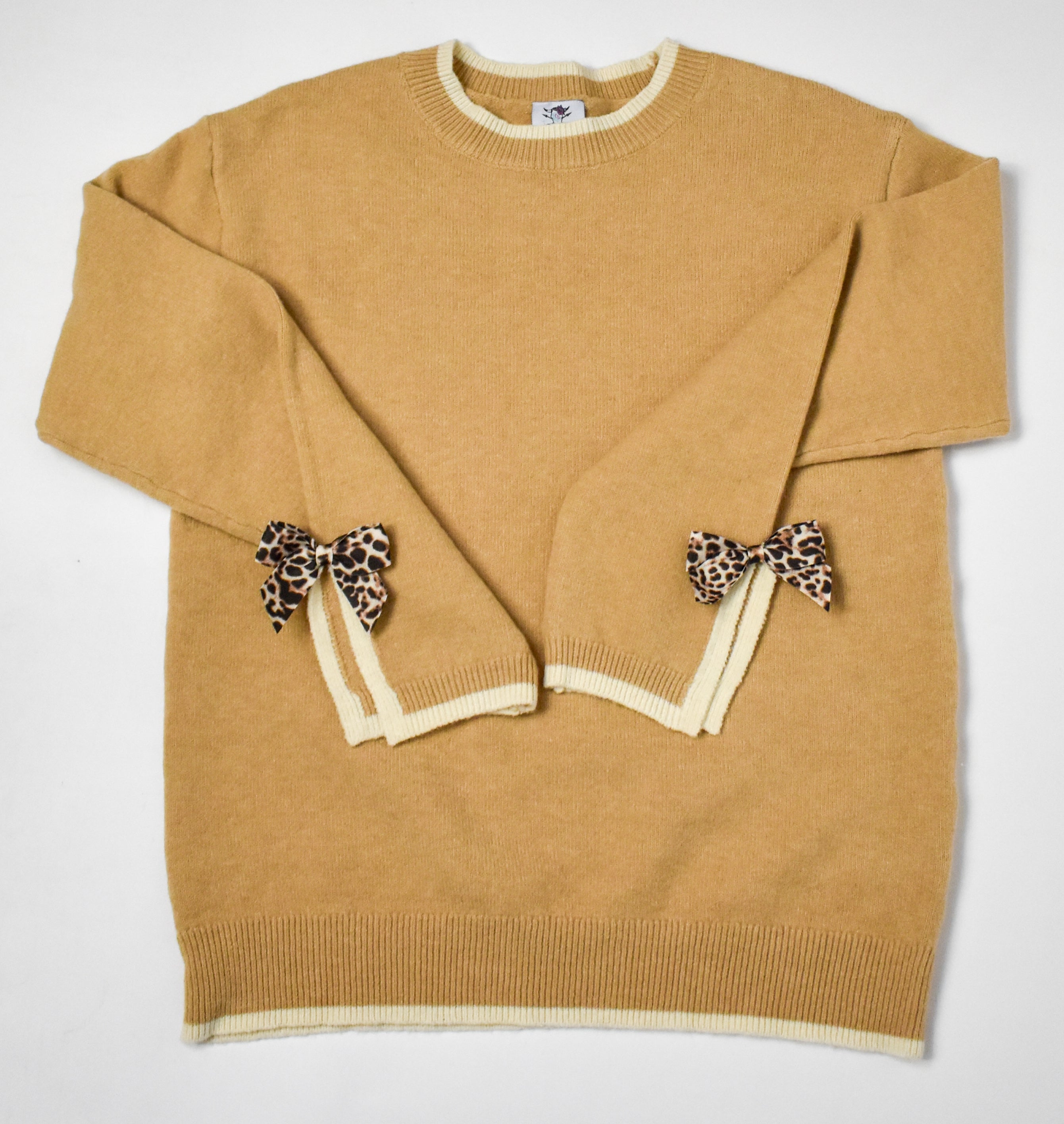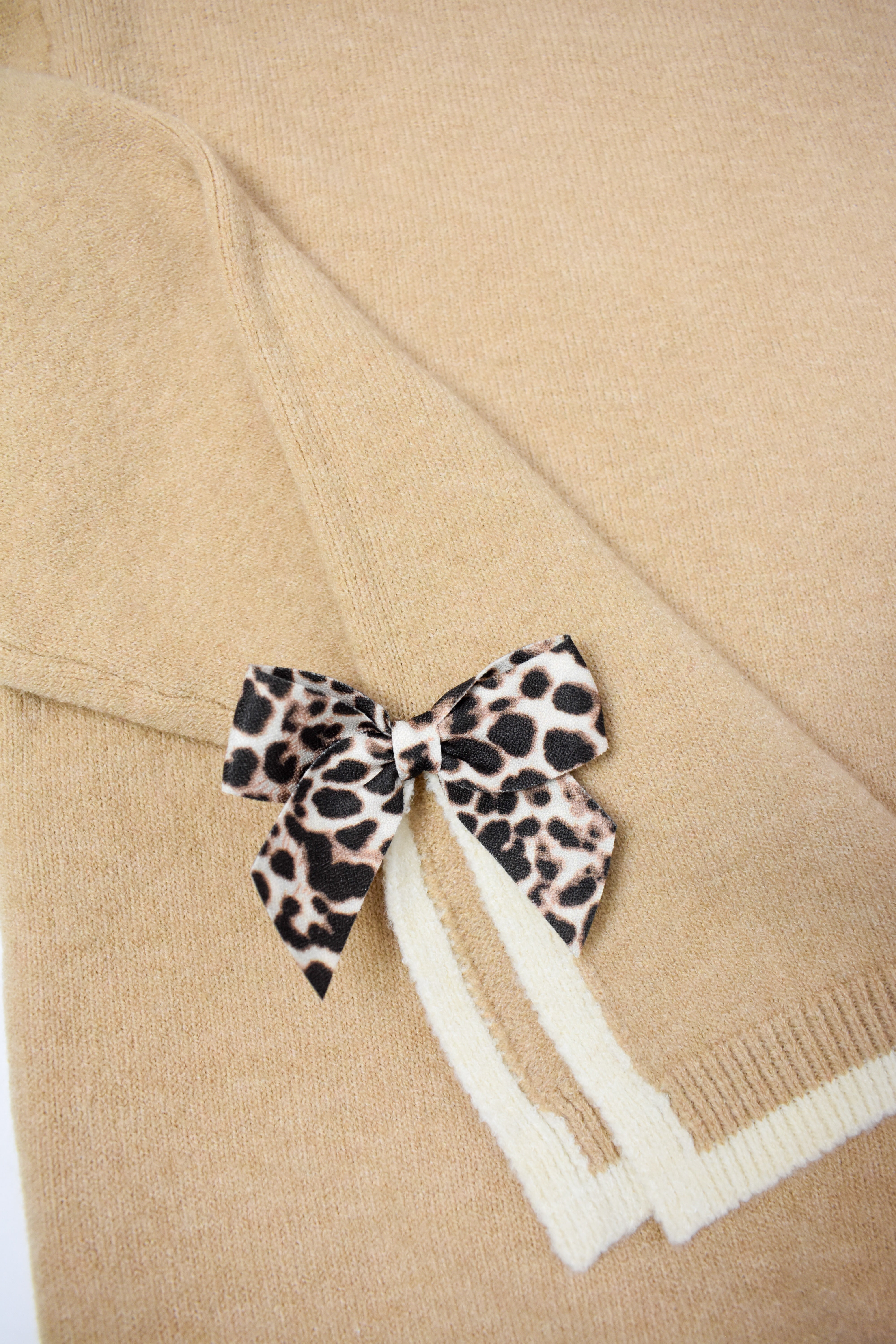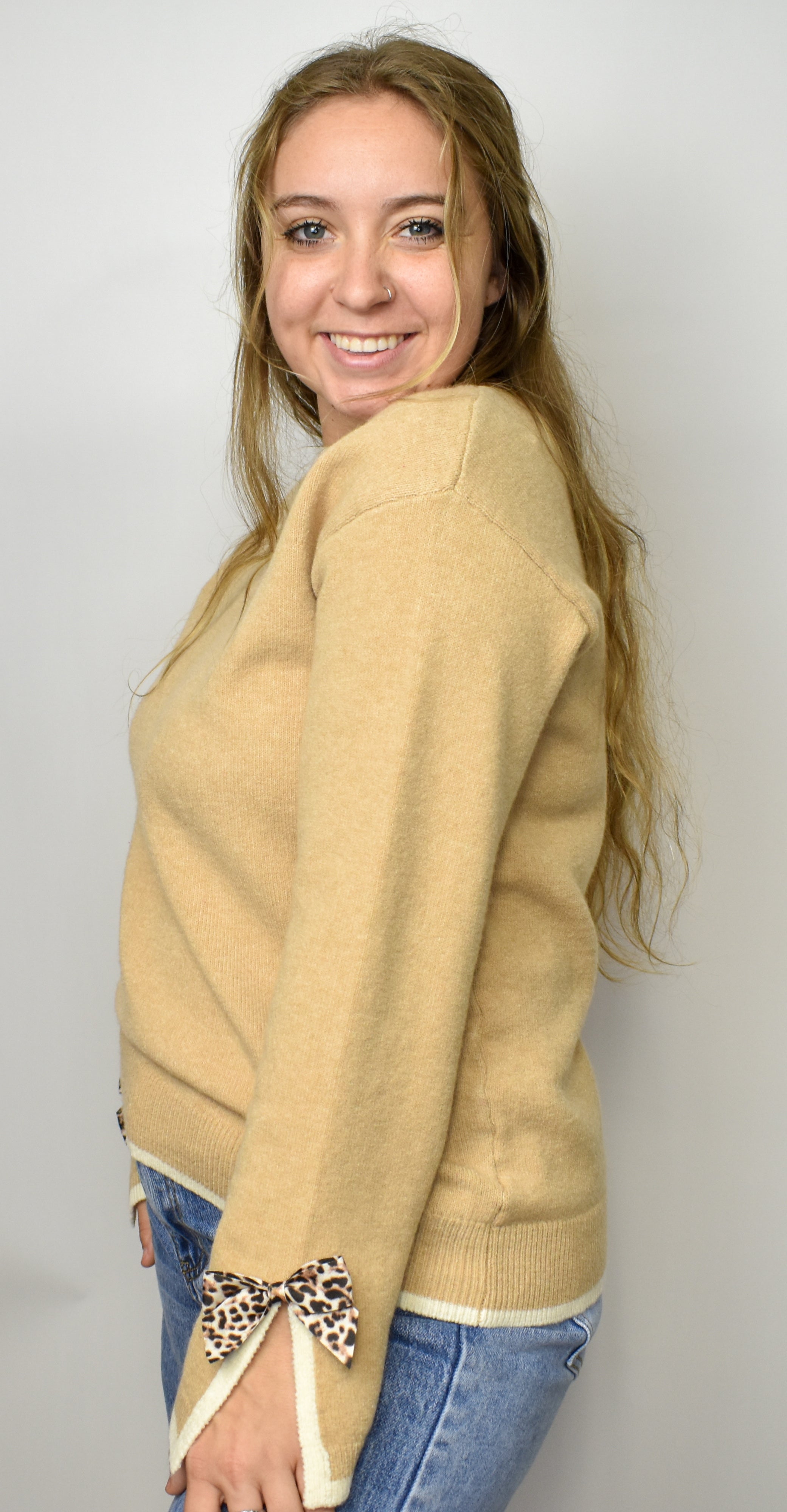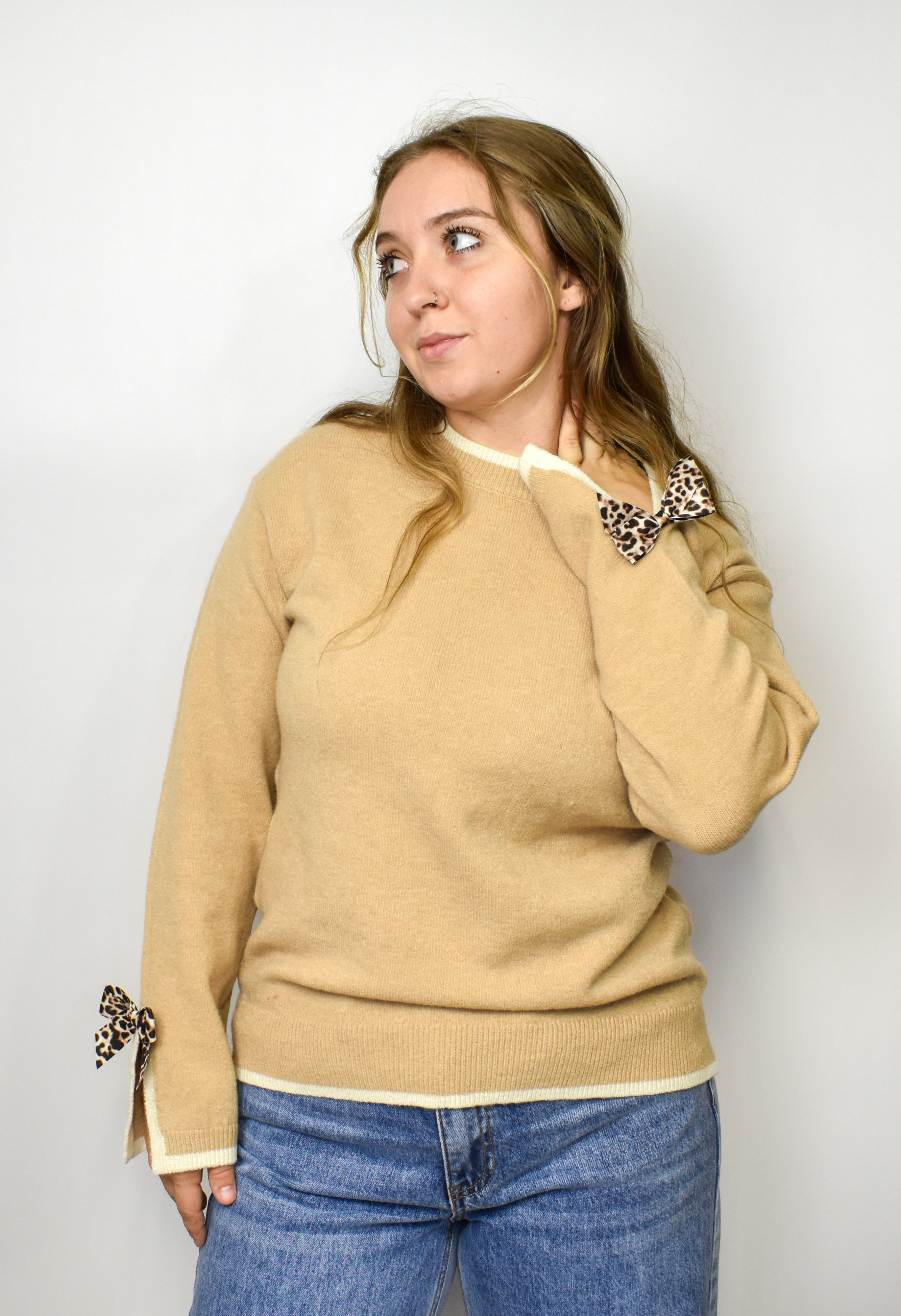 Elevate your wardrobe with the Madelyne Sweater, featuring an expertly crafted leopard bow detail on the sleeve. This elegant piece pairs classic knitwear with a subtle, chic accent, perfect for adding understated sophistication to any outfit. Its refined design ensures versatility for both casual and dressier occasions.