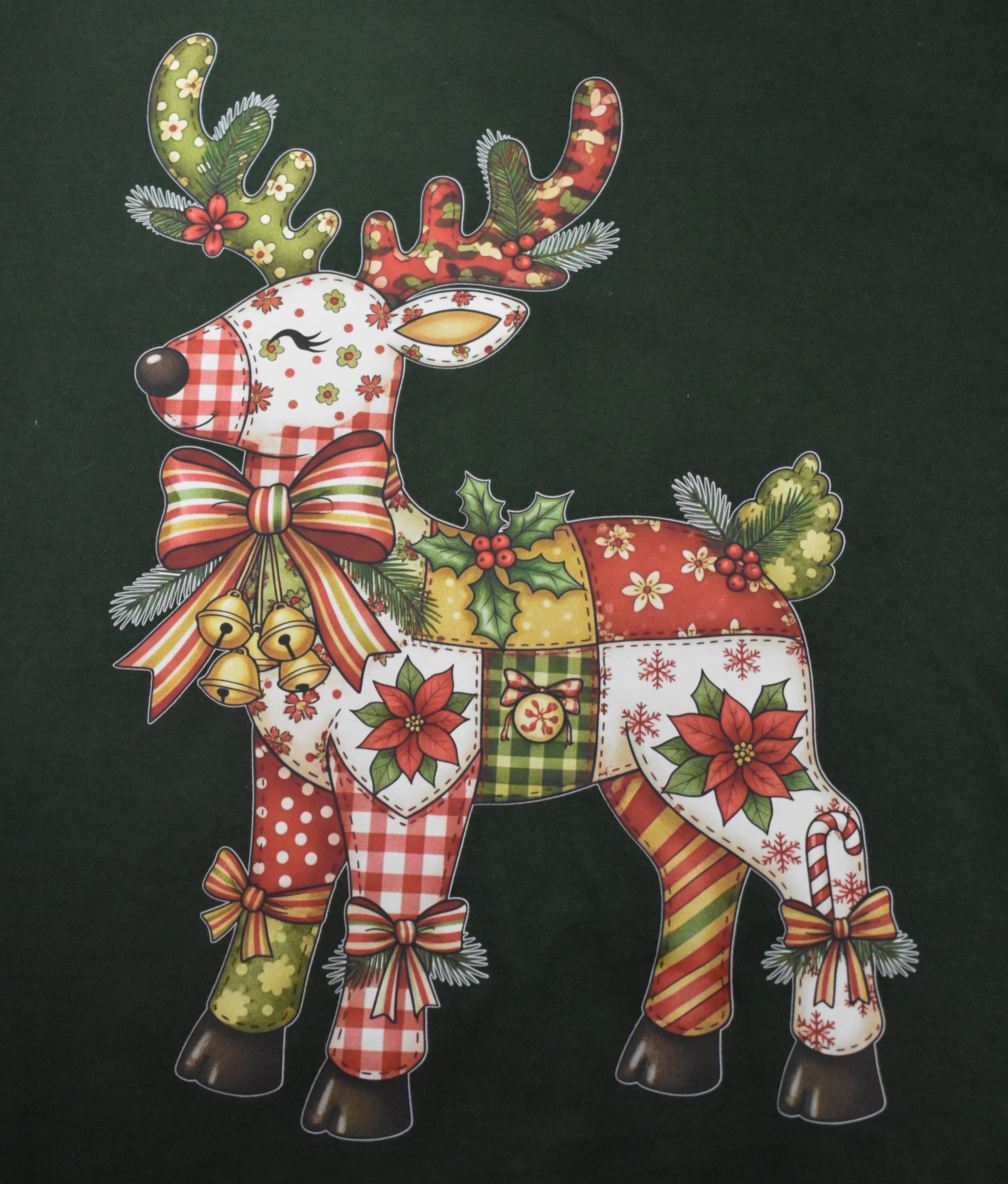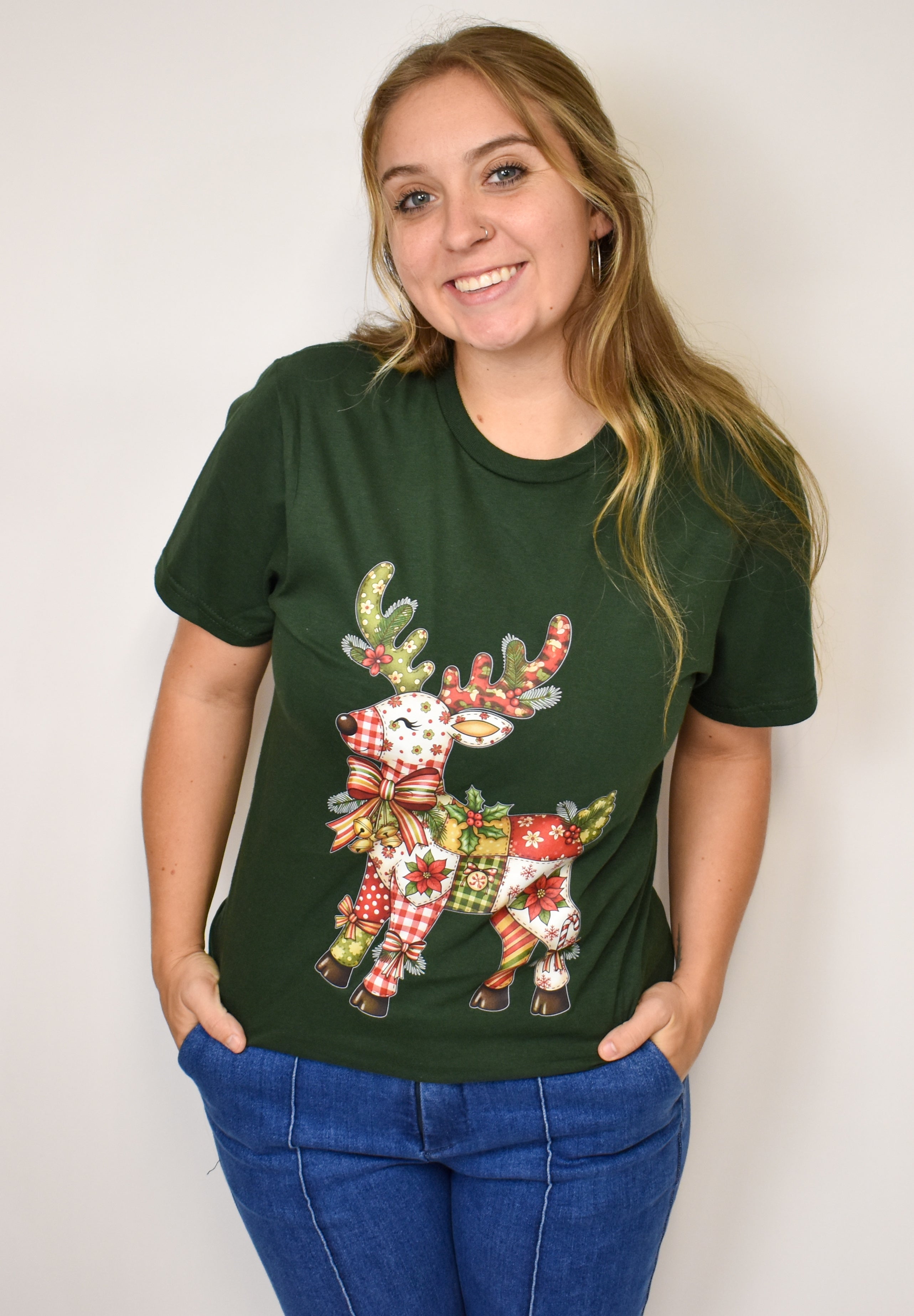 The Patchwork Prancer Graphic Tee masterfully blends festive patchwork patterns to embody the holiday spirit with subtle elegance. Crafted for comfort and style, this tee invites warmth and cheer into your seasonal wardrobe, making it a versatile choice for celebrating the holidays with a touch of artistic charm.