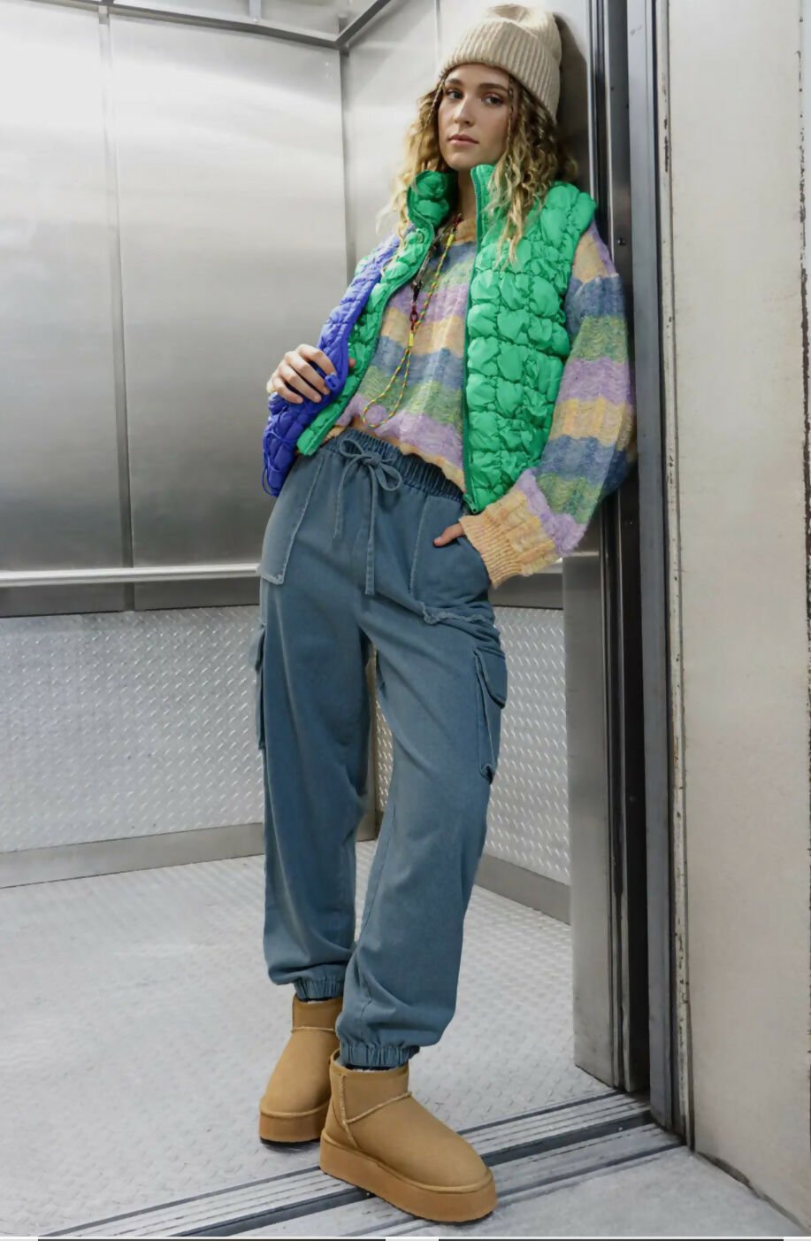 Washed Denim Cargo Joggers. Has elastic waste with side pockets and frsyed details.