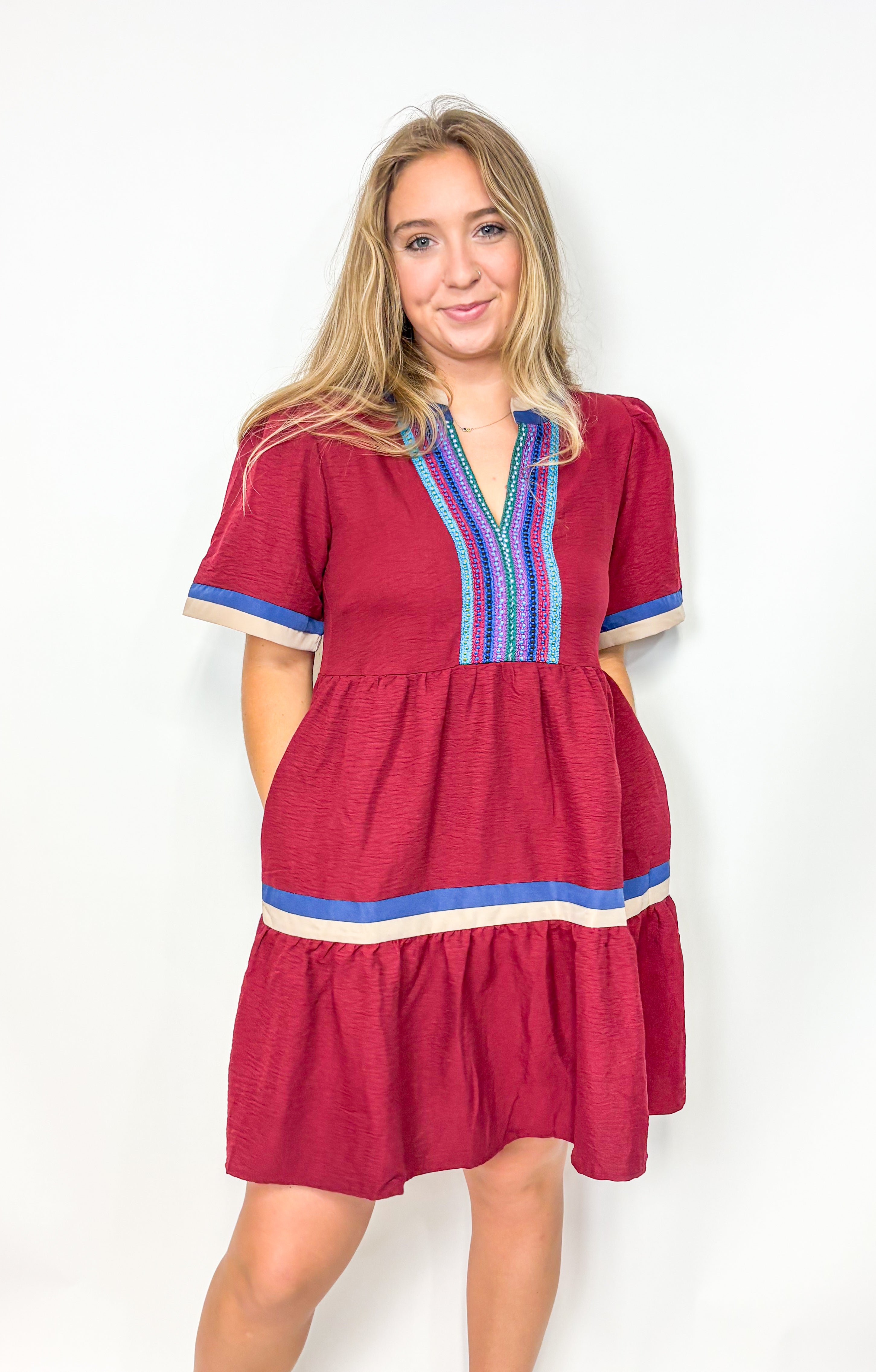 Step into effortless charm with the Beckett Tired Mini Dress. This playful half-sleeve, V-neck woven dress features a trendy tiered design and handy pockets for your essentials. Perfect for sunny days or casual nights, it combines comfort and style in one flirty package.