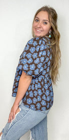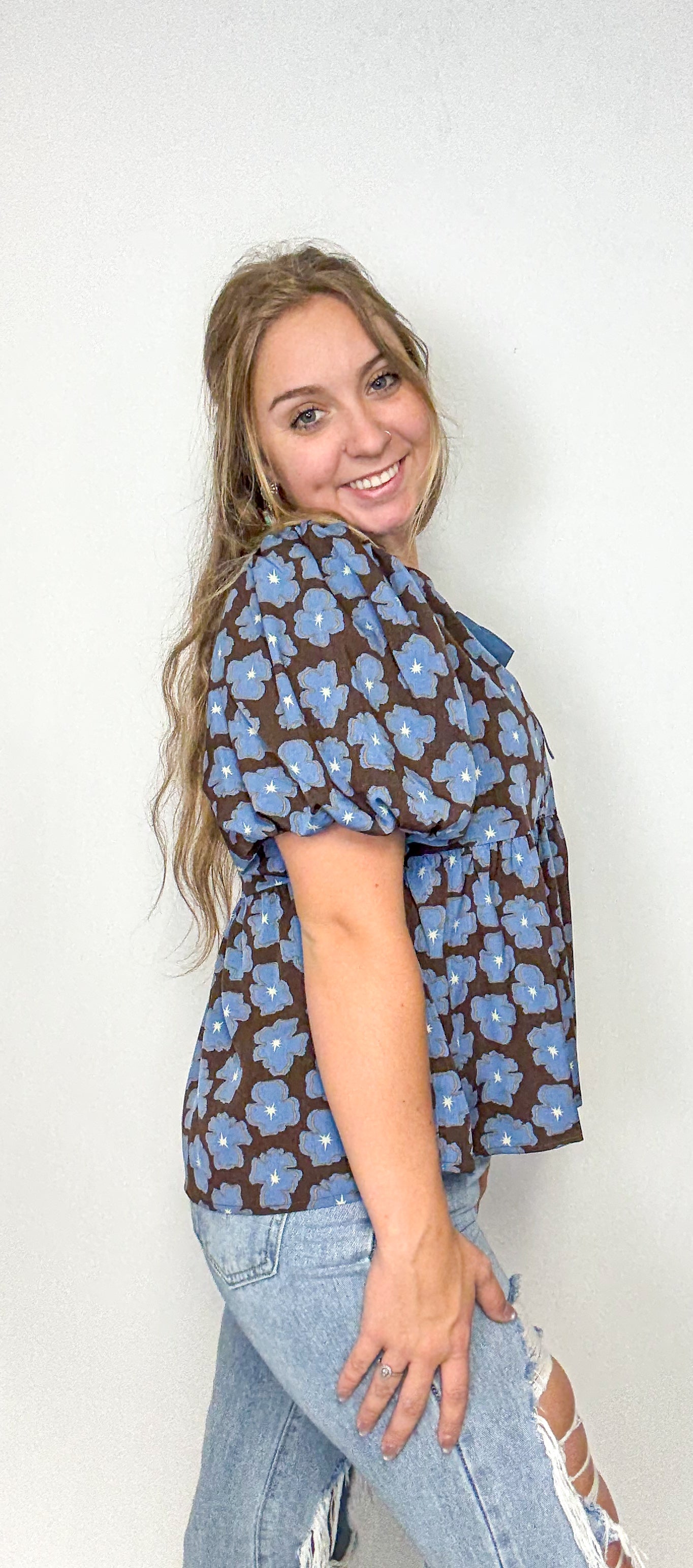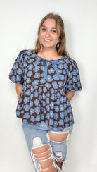 Add a splash of charm to your wardrobe with the Blue Floral Baby Doll Top. Crafted from 100% polyester, its playful blue and brown tones are accented with a cute bow tie, offering a fun, flirty look that's light and comfortable all day long. Perfect for brightening up any casual outing with a touch of whimsy.