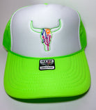 Get ready to stand out in the crowd with our Neon Skull Trucker Caps! These custom designed caps are available in a variety of eye-catching colors, making a fun and unique addition to any outfit. Embrace your playful side with these quirky caps and show off your individuality. (limited edition, perfect for concerts/parties!)
