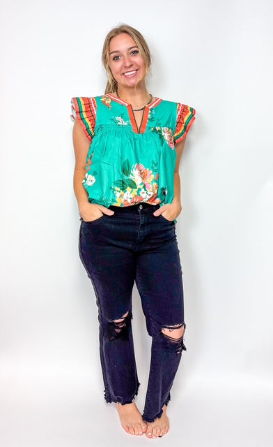 Brighten your wardrobe with the Olivia Floral Top, featuring a charming floral print that adds a splash of fun to any outfit. Its border flutter sleeves bring a flirty, breezy vibe, while the placket detail adds a touch of classic style. Perfect for playful days out or casual gatherings, this blouse combines comfort and whimsy effortlessly.