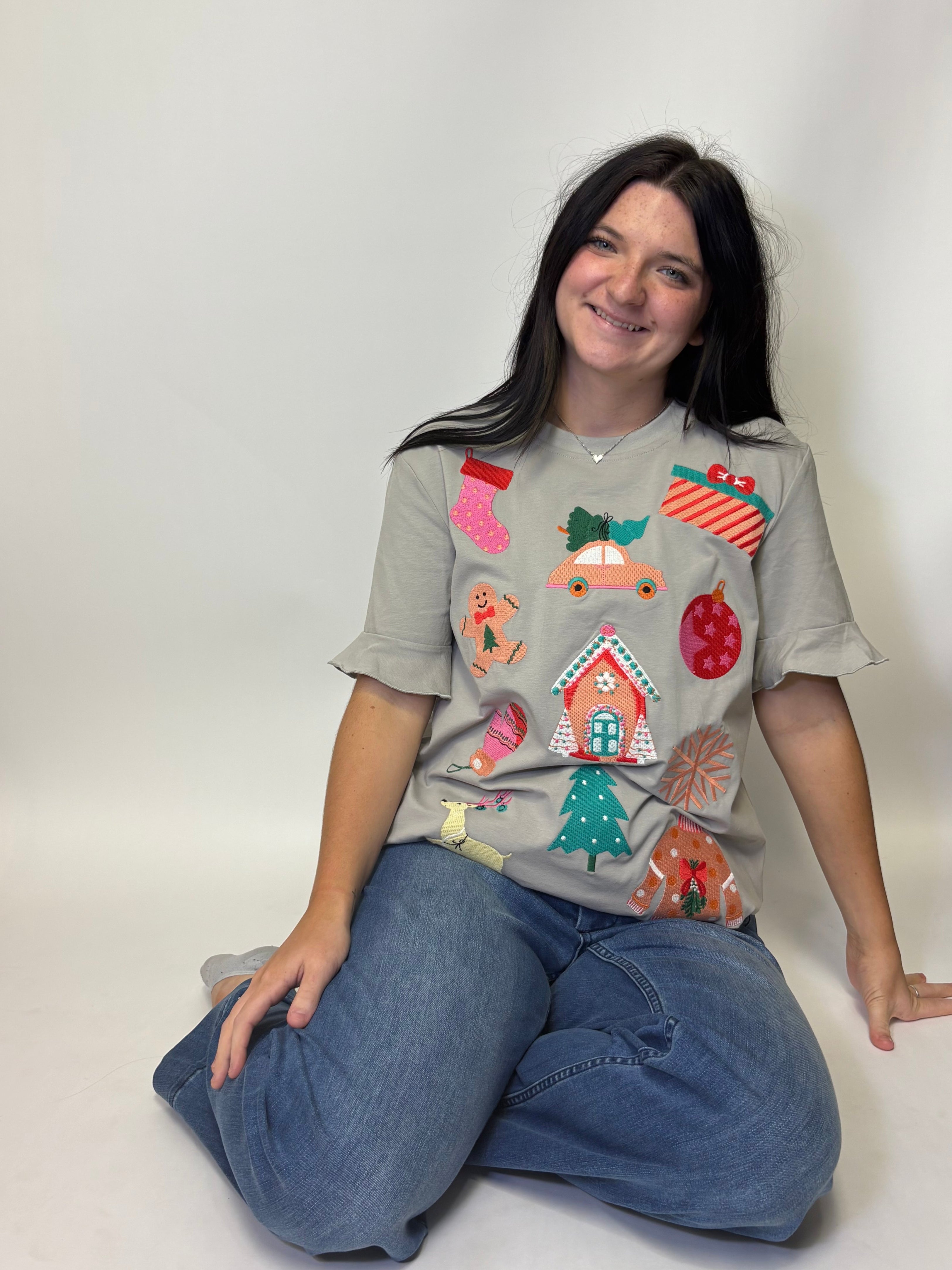 Celebrate the season with The Not So Ugly Xmas Tee, featuring fun embroidered holiday designs and charming ruffle sleeves. This playful tee adds a festive twist to your wardrobe, perfect for spreading cheer with a touch of whimsy and style.