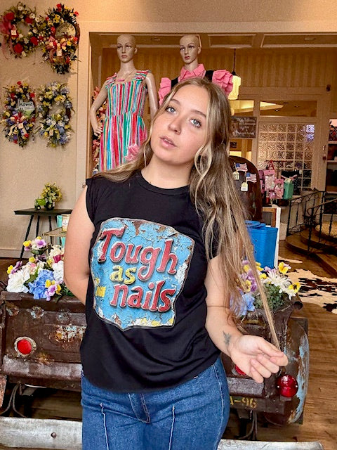 Embrace your inner strength with our "Tough As Nails" Graphic Tank. This playful yet powerful statement piece celebrates the woman who tackles life head-on without sacrificing style. Perfect for pairing with jeans or shorts, this tank lets your resilient spirit shine through while keeping you cool and confident. Wear your toughness with pride!
